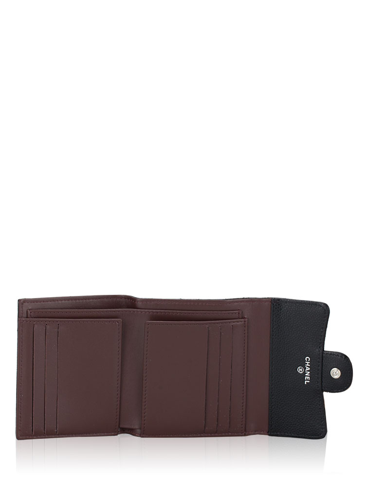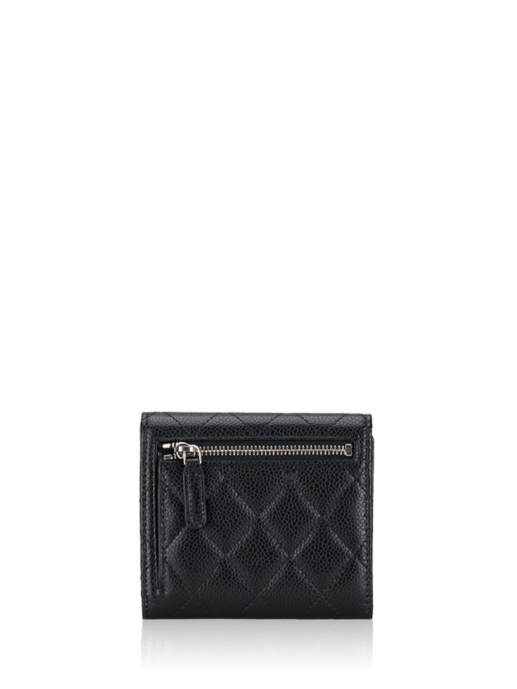 This wallet is crafted of luxurious diamond quilted caviar leather. The wallet features a small polished brass Chanel CC logo and a rear zipper pocket. The wallet opens to a matching interior with card slots and a bill pocket.