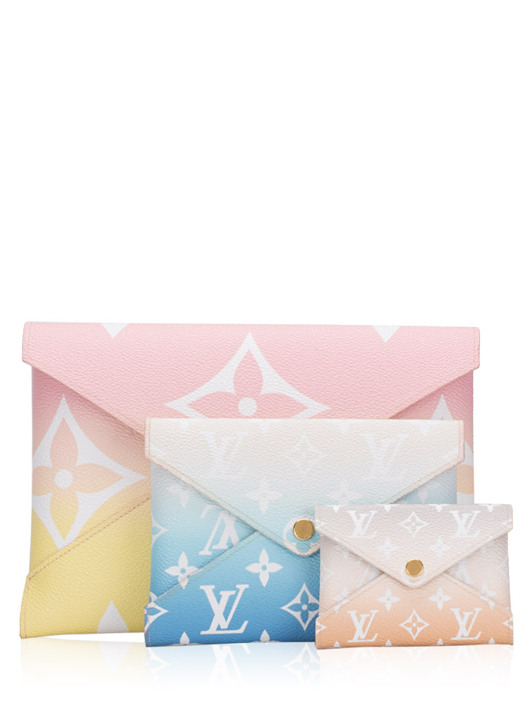 Crafted of Louis Vuitton monogram toile canvas in tie-dye. They each feature a flap with a snap that opens to a leather interior with a medium pochette and a small pochette.