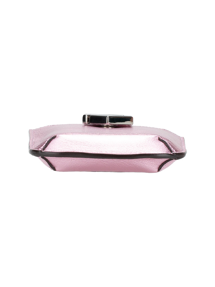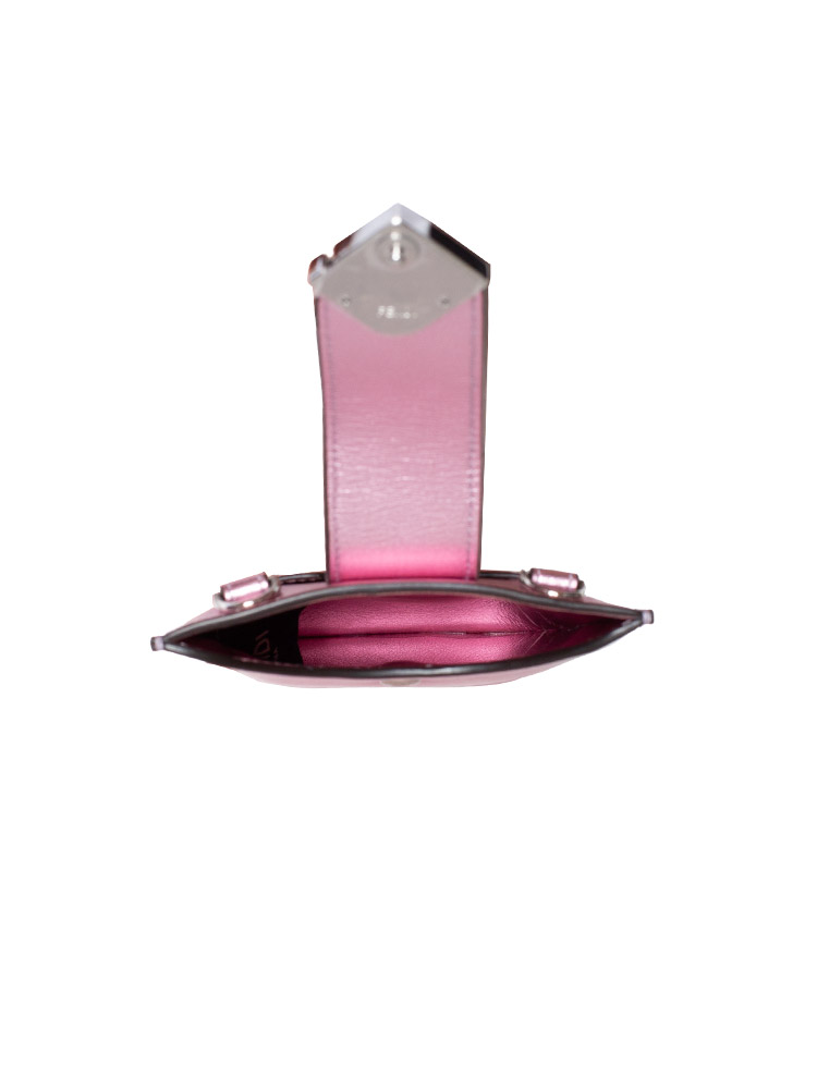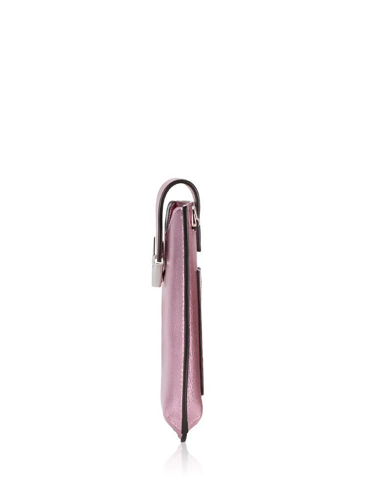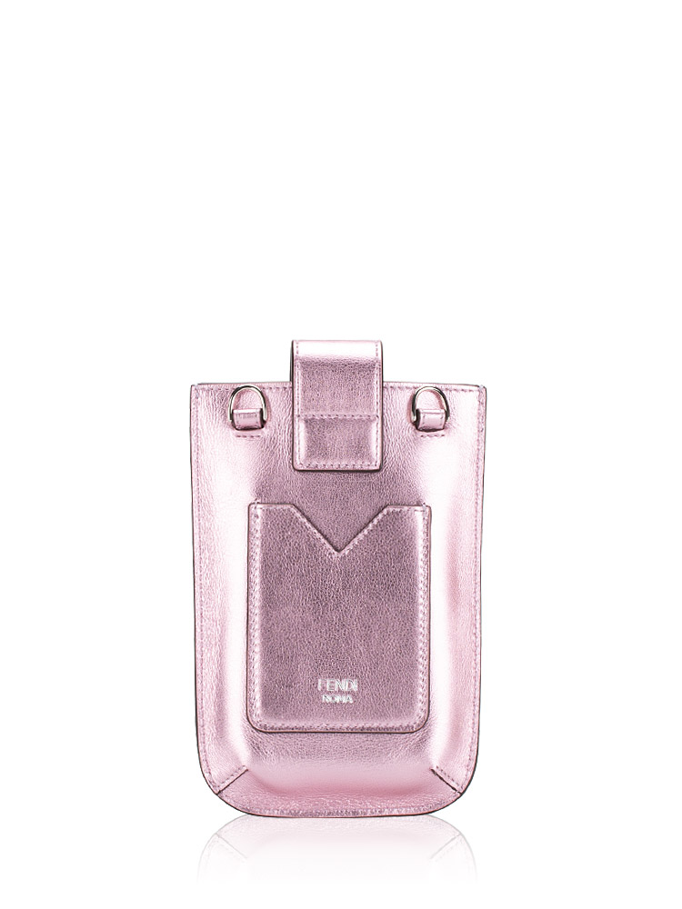 This phone bag is crafted of calfskin material. Features rear card slot and an optional thin shoulder strap. The leather strap unsnaps to a leather interior.