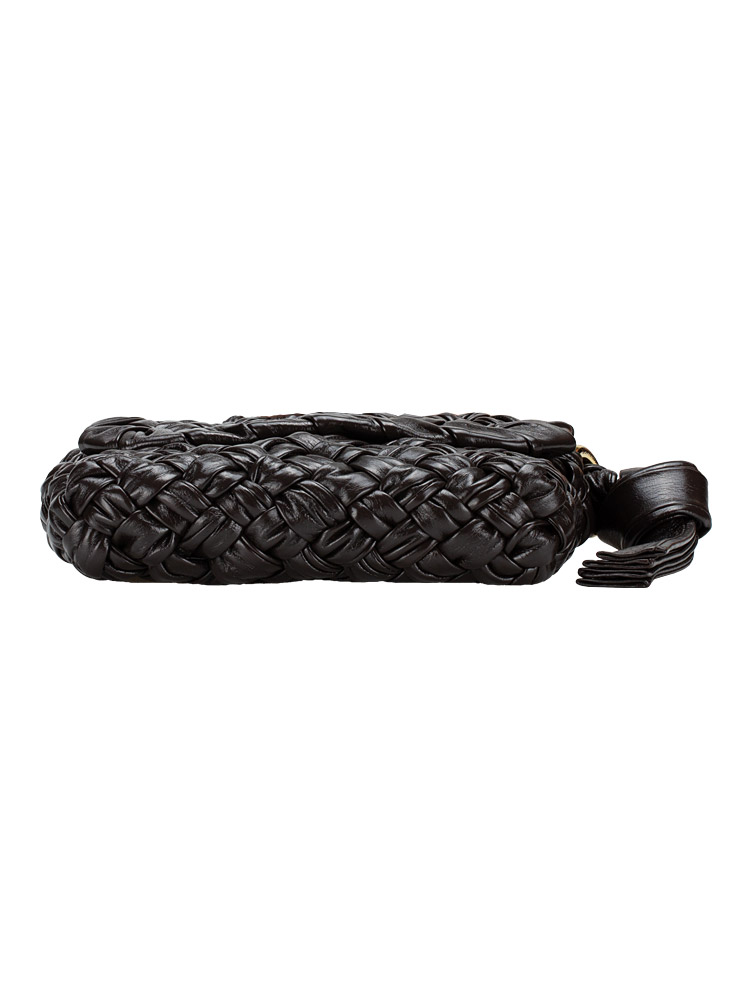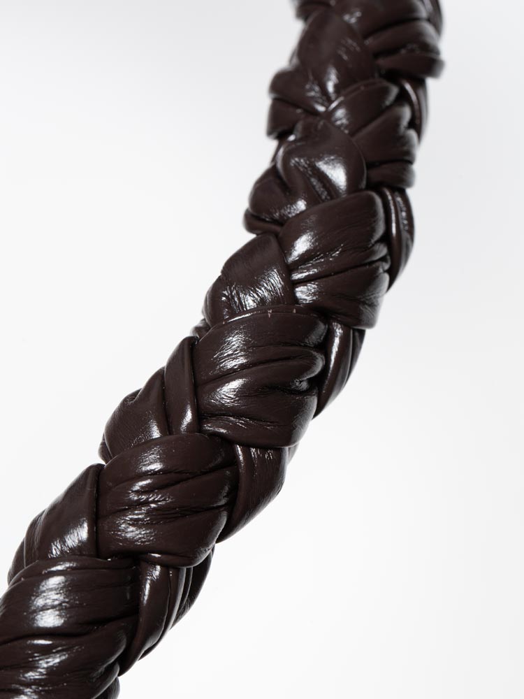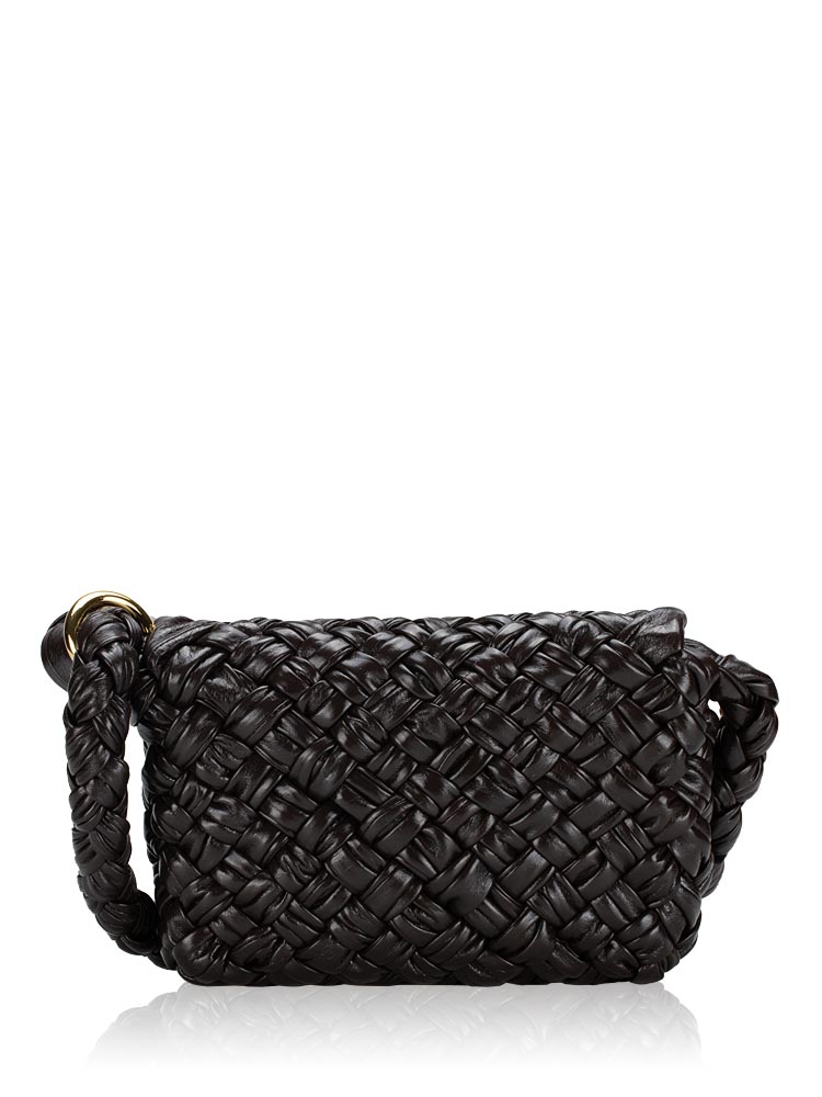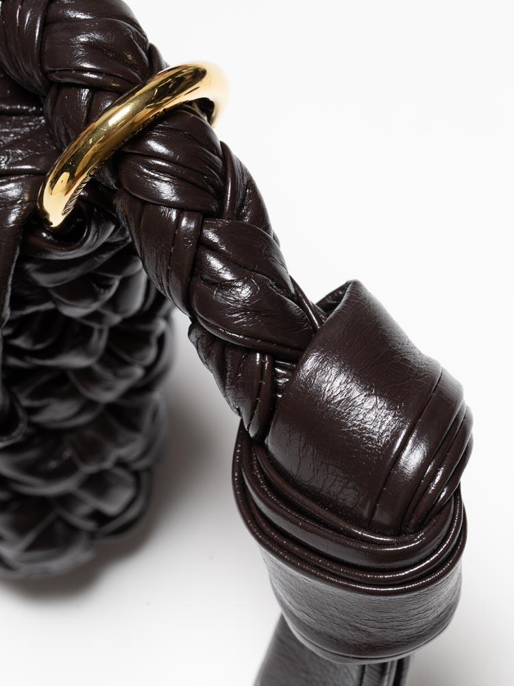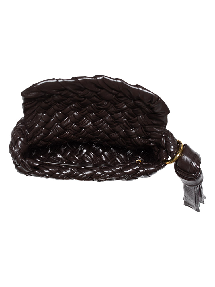 This shoulder bag is crafted of woven and pleated calfskin leather in brown. The bag features a leather shoulder strap with gold metal links and a half-facing flap. This opens to a matching interior with a leather zipper pocket.