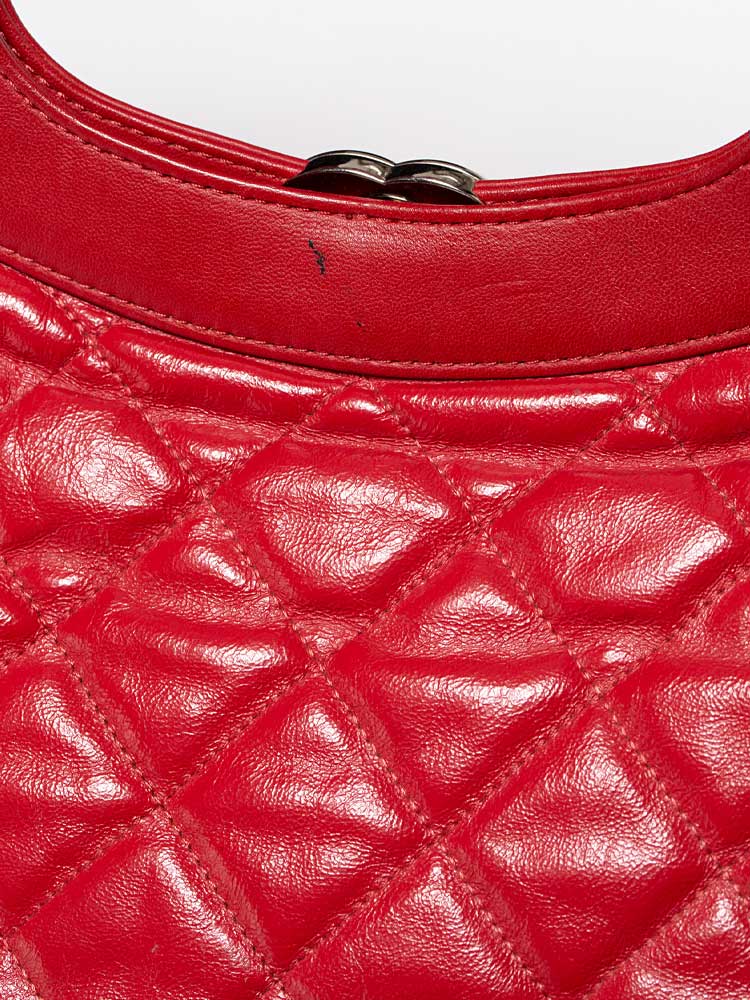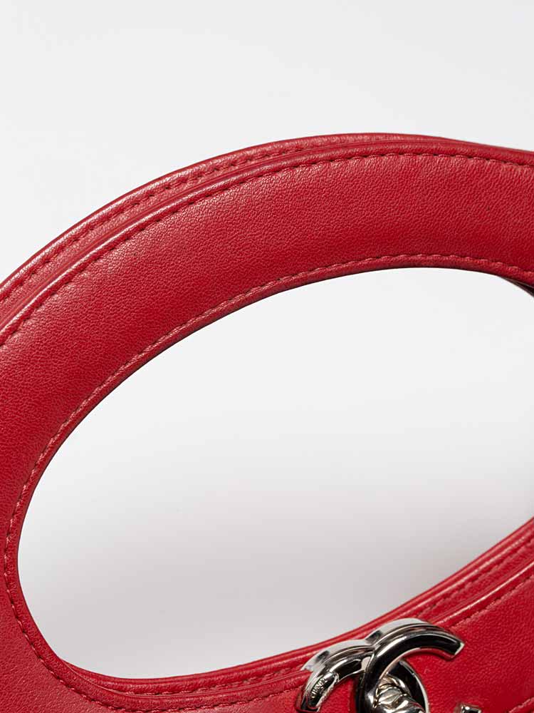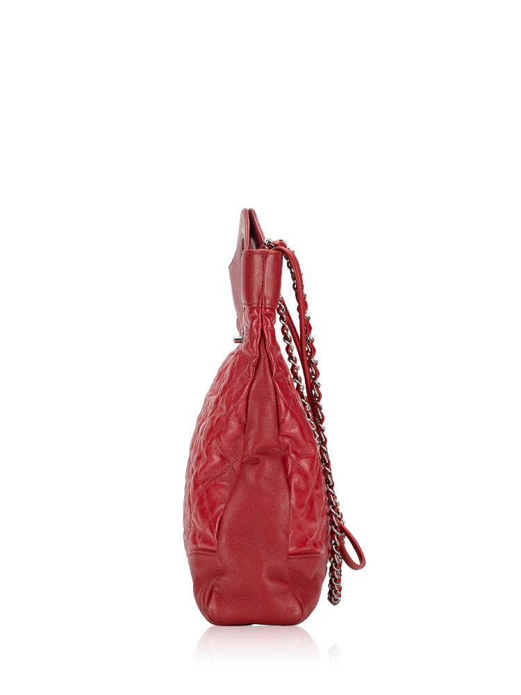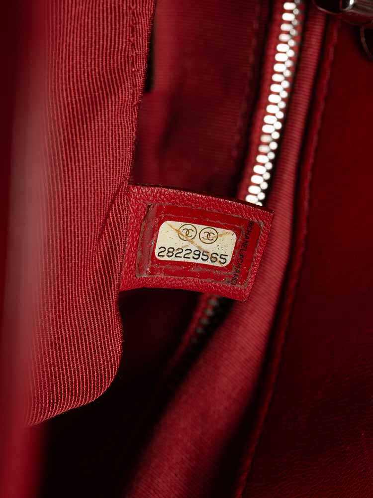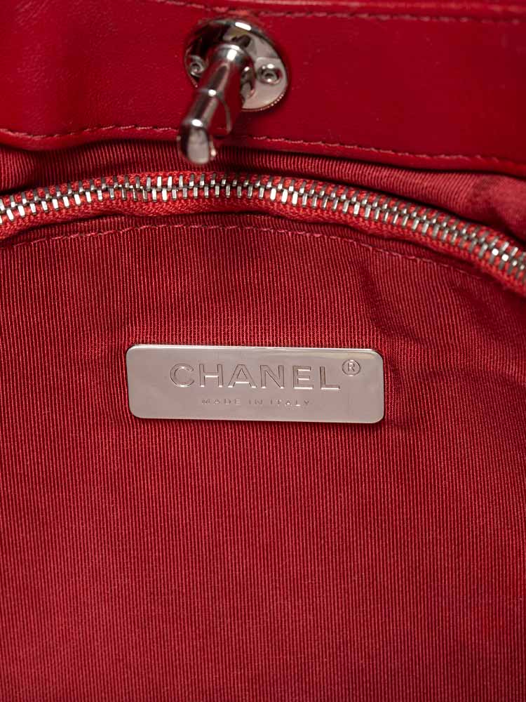 Crafted of diamond quilted calfskin leather material. The bag features red handles, a long shoulder strap and a Chanel CC turn lock. The top is open to a fabric interior with zipper pockets.