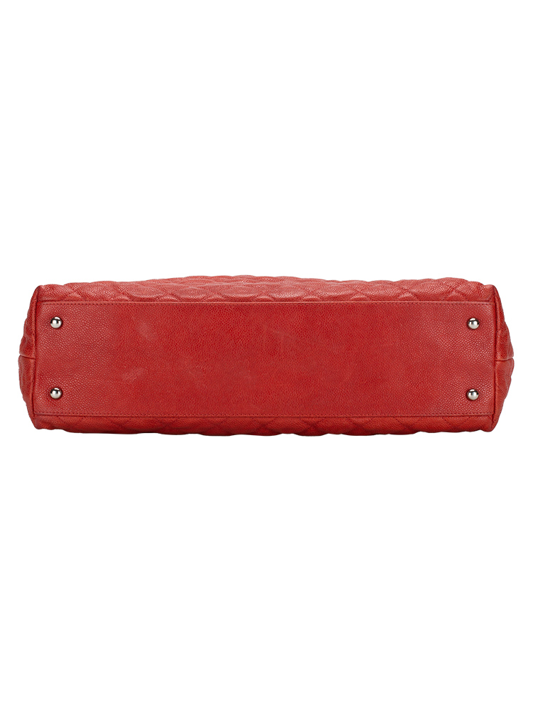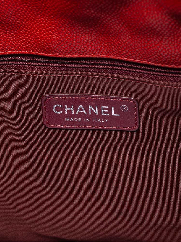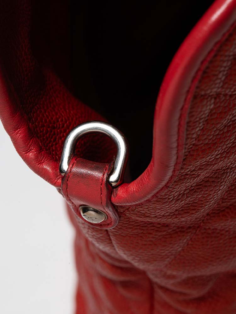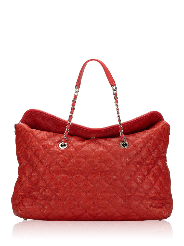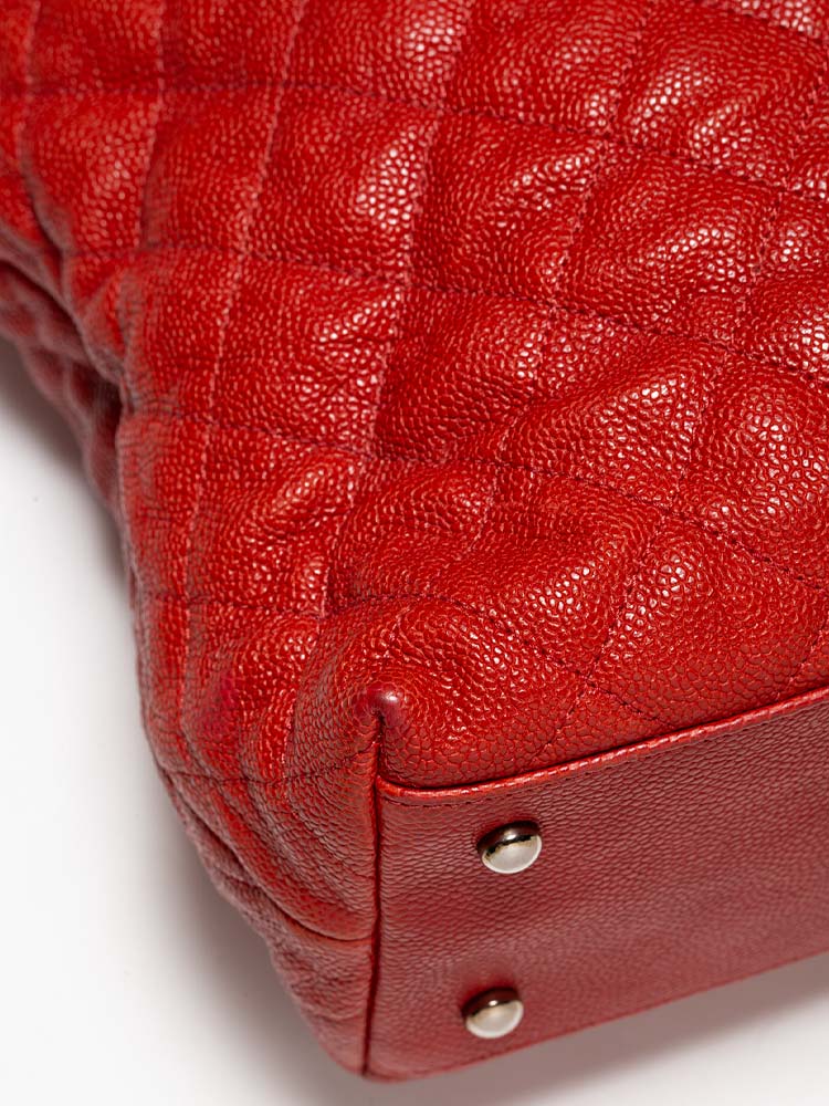 Crafted of diamond quilted caviar leather. Features silver chain link shoulder straps threaded with leather, a leather shoulder pad and silver Chanel CC logo with a rear magnet.