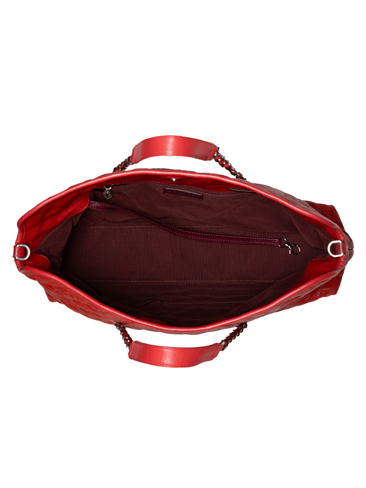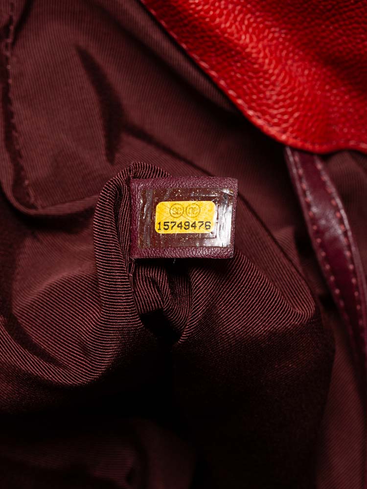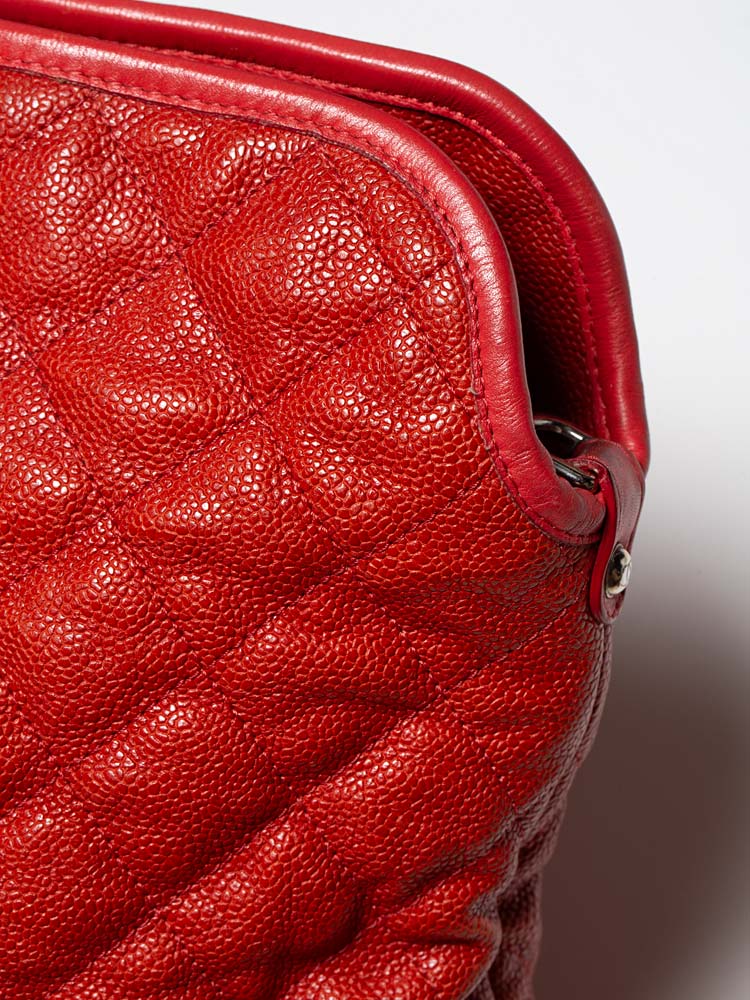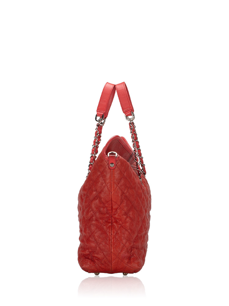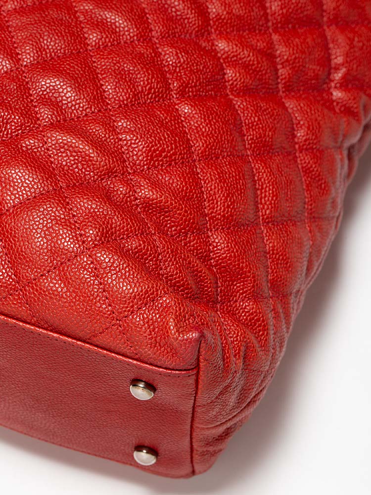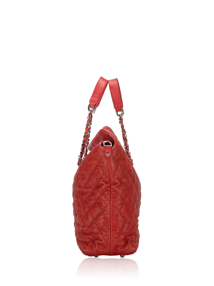 Crafted of diamond quilted caviar leather. Features silver chain link shoulder straps threaded with leather, a leather shoulder pad and silver Chanel CC logo with a rear magnet.