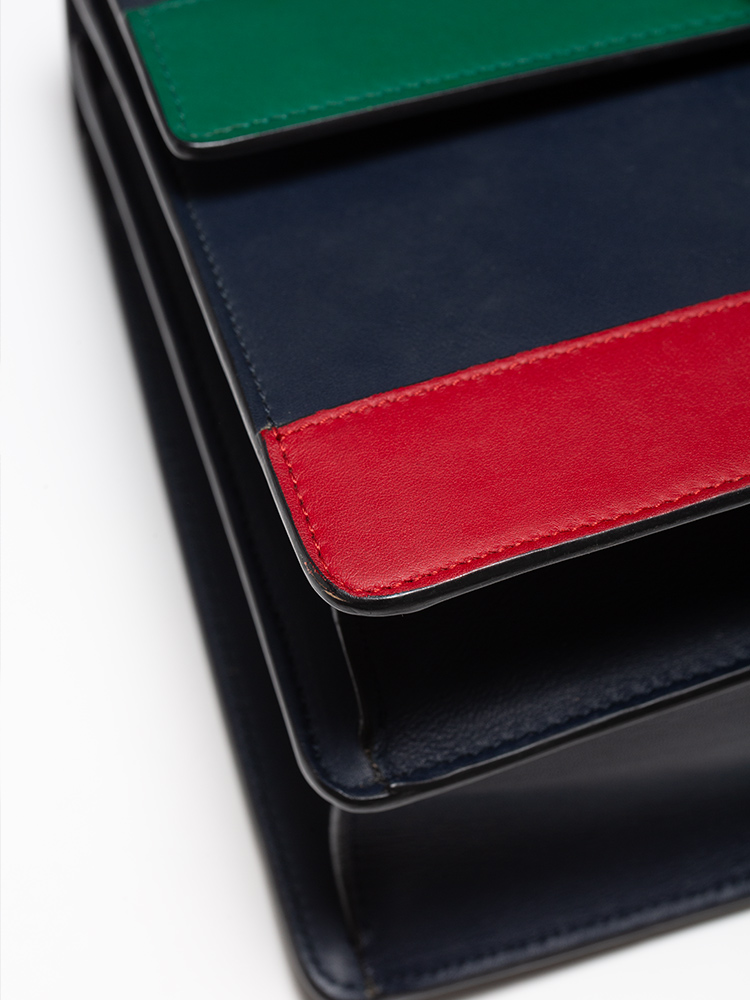 Crafted of calfskin leather with a green and red stripes across the front. Features a bamboo top handle, an optional webbed nylon shoulder strap, and a prominent brass tiger head horseshoe closure.