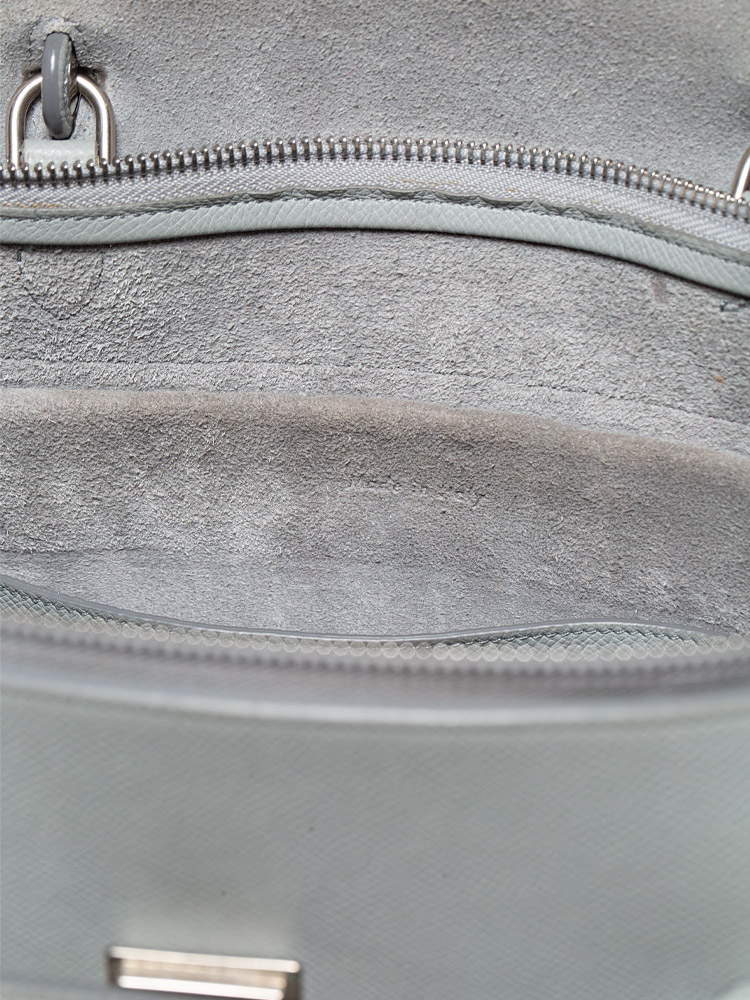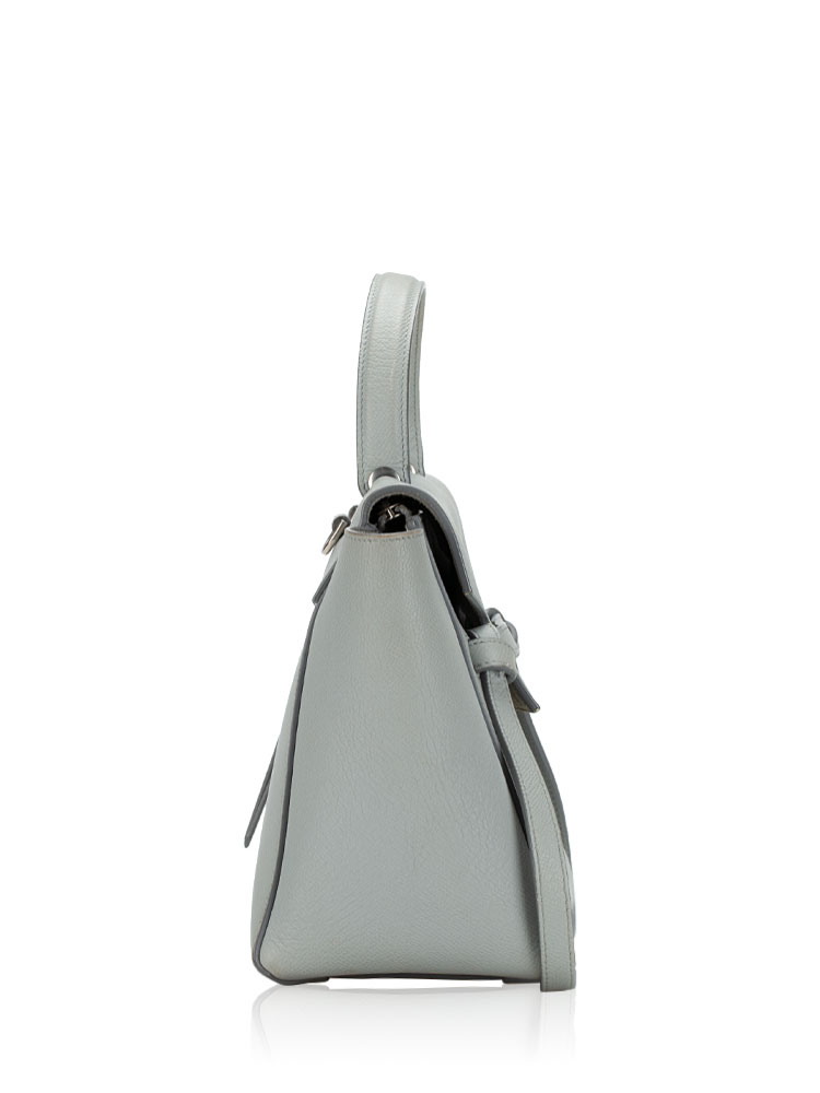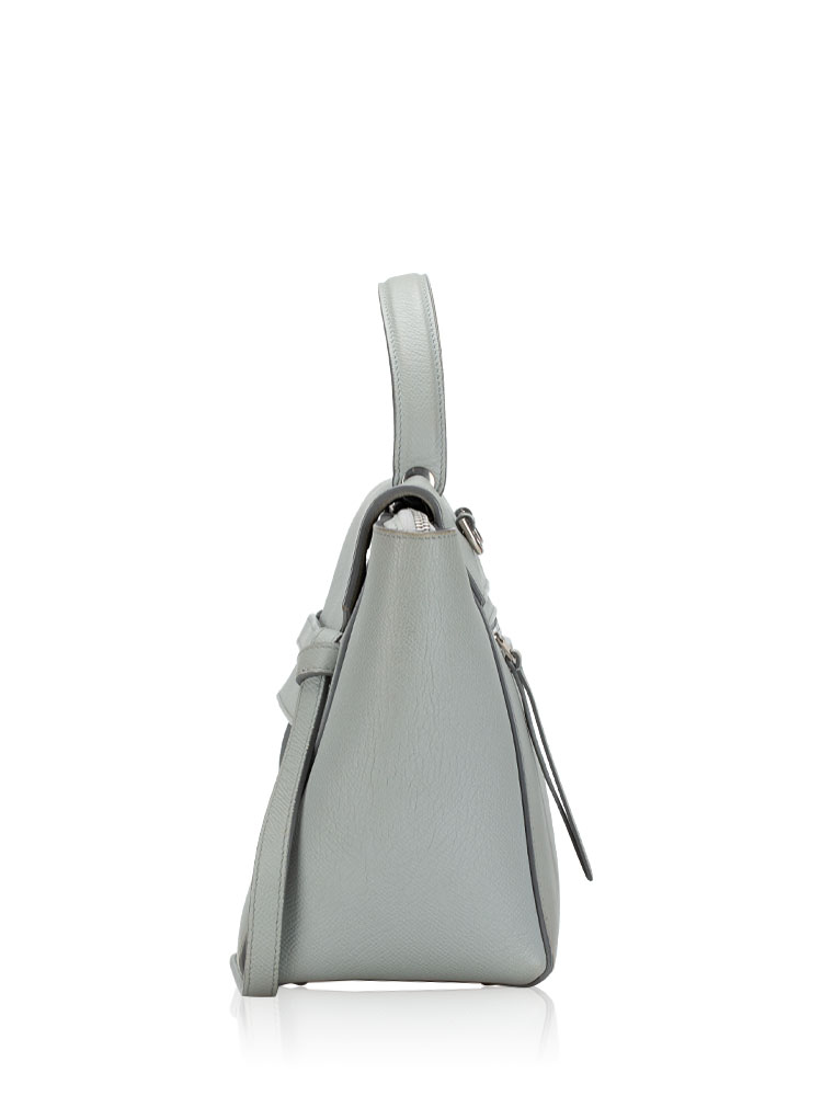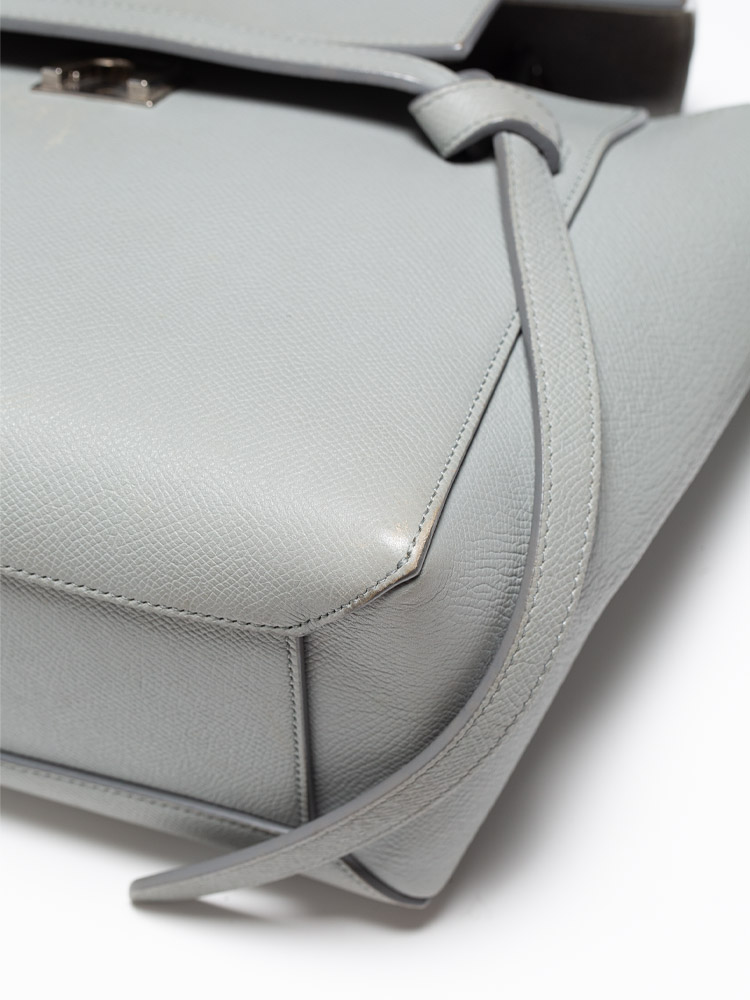 Crafted of grained calfskin leather. Features with a top handle, optional shoulder strap, and a front-facing flap that is secured by decorative knotted straps. The flap opens to a suede interior with a hanging patch pocket.