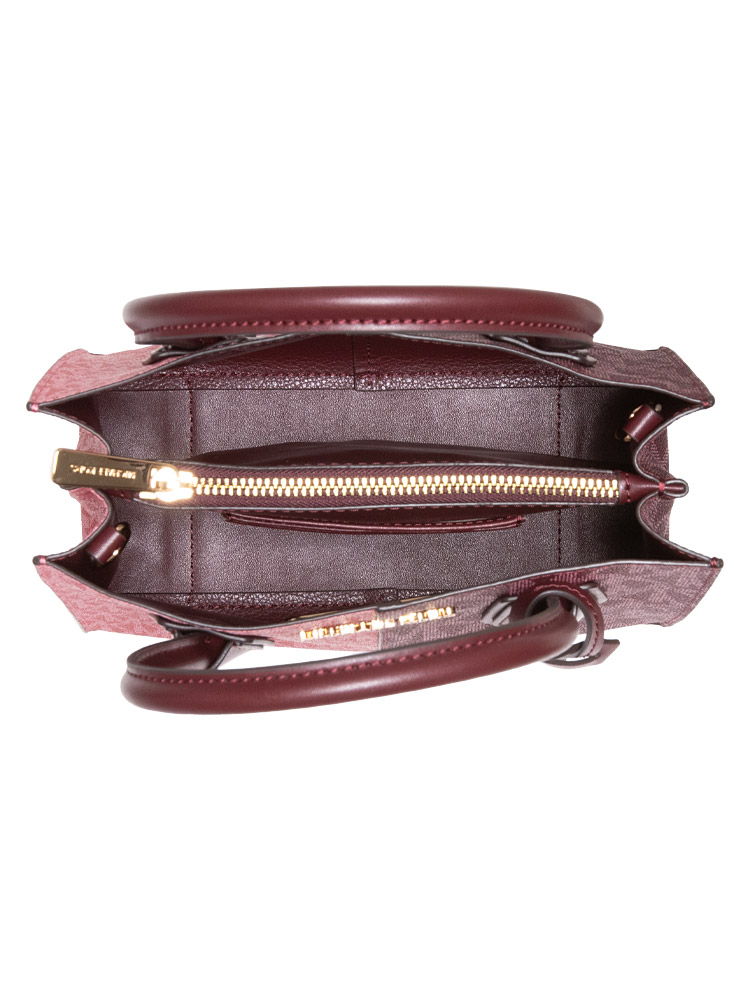 Made of signature coated canvas. The bag features a open top closure that opens to smooth leather and polyester lining with interior one zip pocket, three card slots.