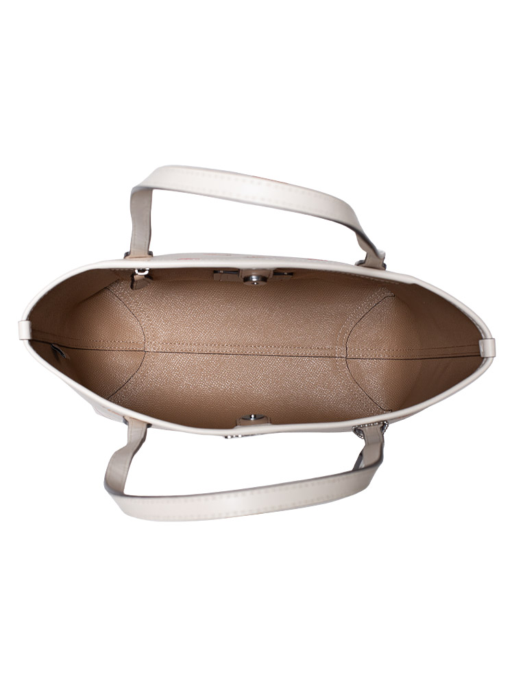 Made of coated canvas and smooth leather. The bag features a on top handle closure that opens to crossgrain leather lining with fabric lining with interior one slip pocket.