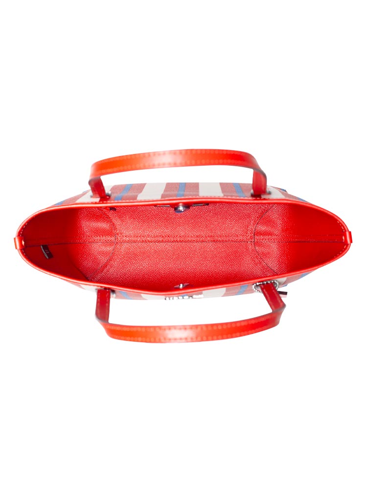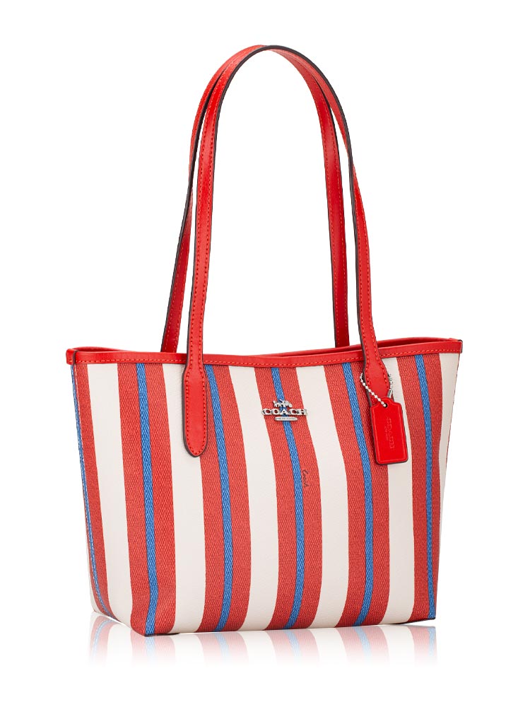 Made of coated canvas. The bag features a magnetic closure that opens to crossgrain and fabric lining with 1 zip pocket, double handles drop 28 cm.