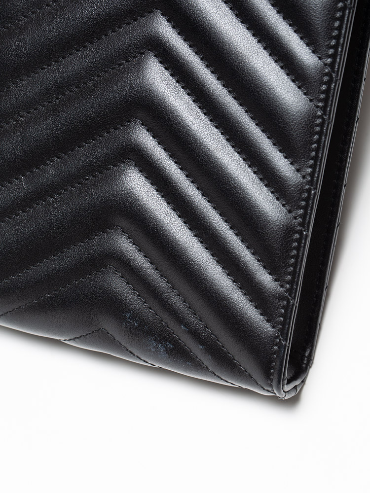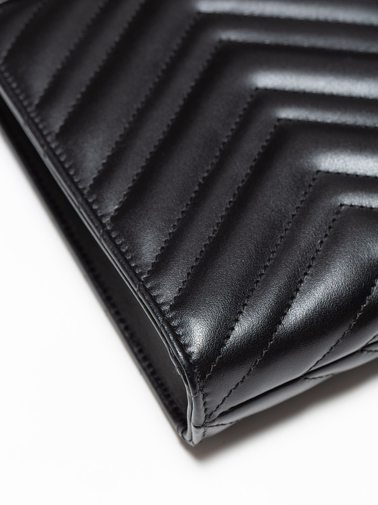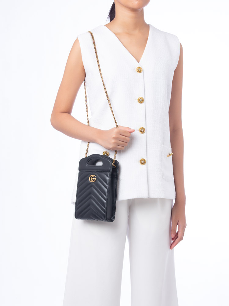 This bag is crafted with chevron quilted calfskin leather. Features an aged gold chain-link shoulder strap and interlocking GG logo. The top is open to a suede interior with 2 card slots.