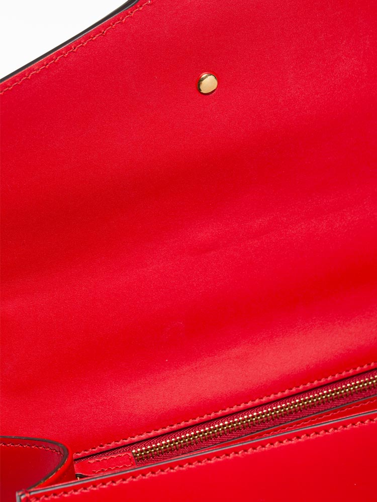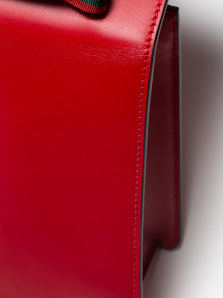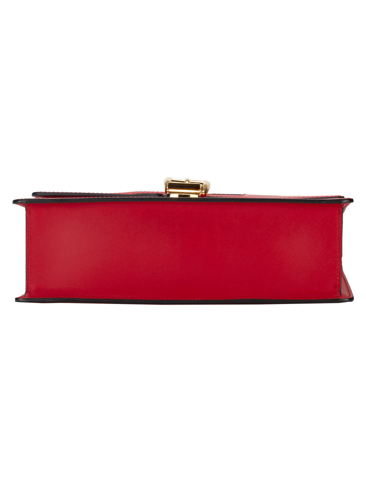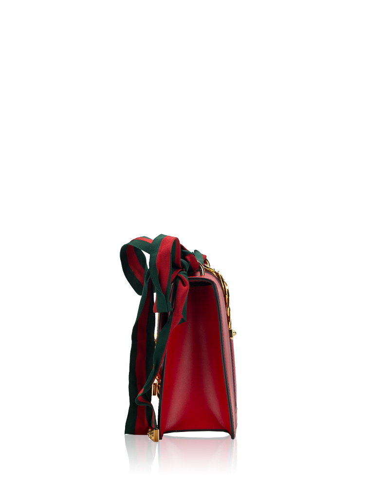 Crafted of calfskin leather. It features a prominent front flap detailed with a central nylon red and black web stripe embellished with a chain buckle lock closure and two interchangeable and detachable shoulder straps.