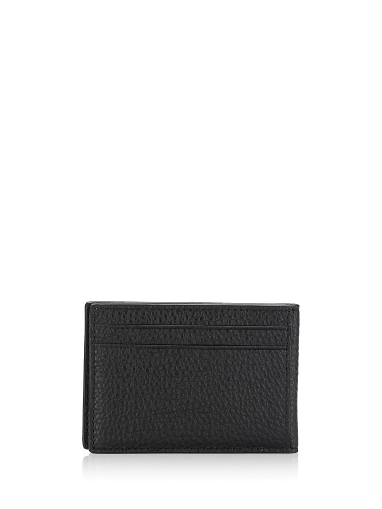 Made of pebble leather. The wallet a folding closure that opens to pebble leather and fabric lining with interior id window slip pocket, three card slots and exterior three card slots.