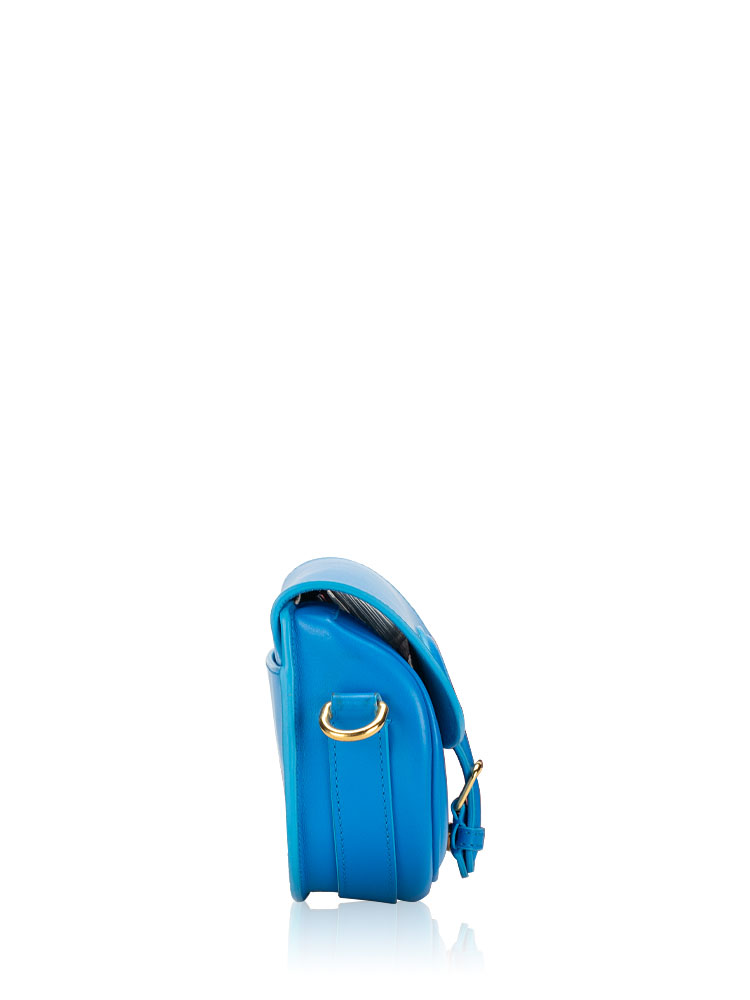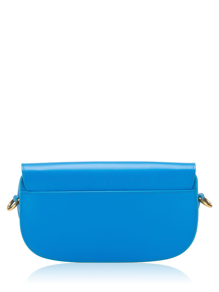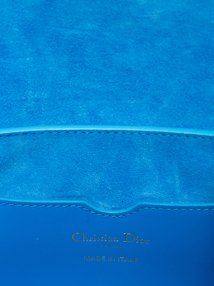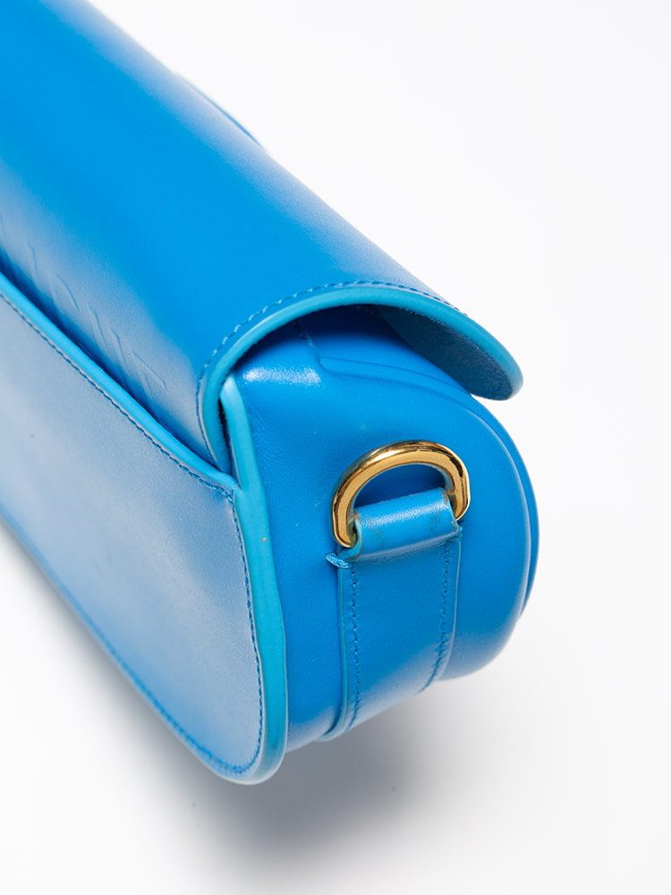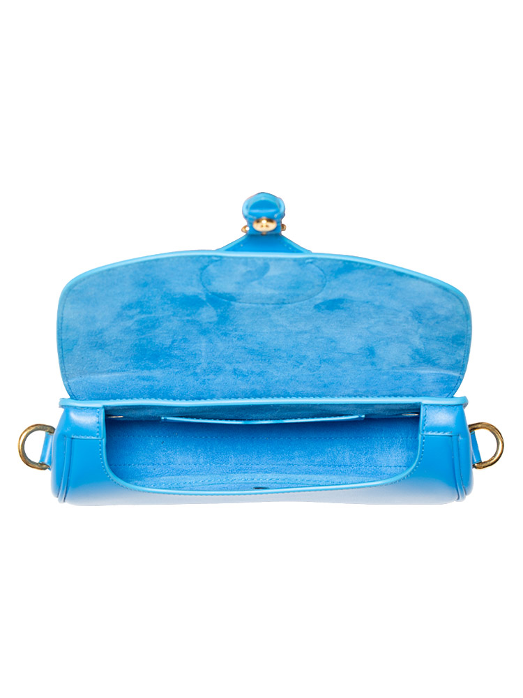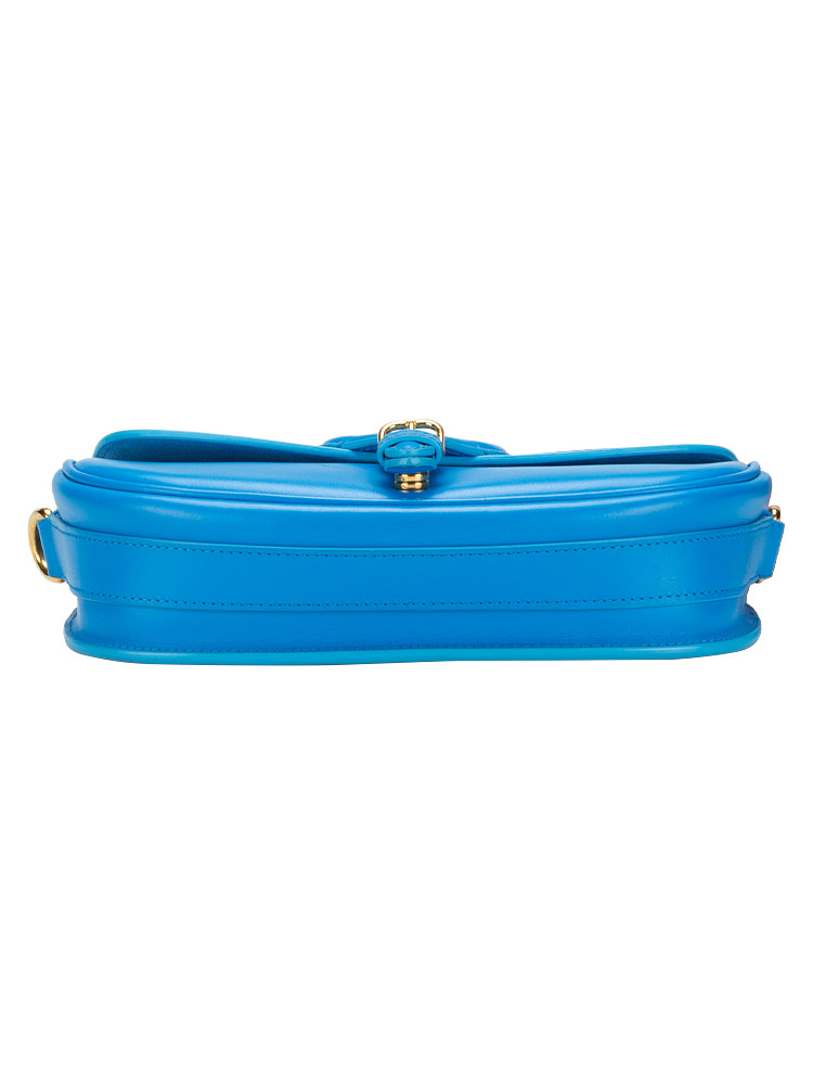 This flap bag is crafted of smooth calfskin leather in blue. The bag features an adjustable shoulder strap and polished gold hardware. The flap opens to a blue suede interior with a patch pocket.
