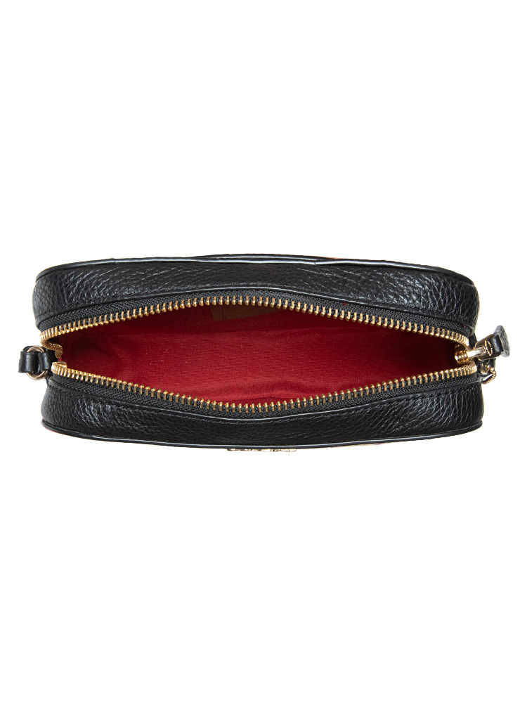 Crafted from refined pebble leather It features an open zip closure, two credit card slots, inside multifunction pocket, fabric lining and outside open pocket. Adjustable strap with 23 inc drop for shoulder or crossbody wear.