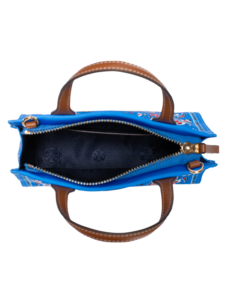 Made of nylon with fabric lining. The bag features an open zip closure, gold tone hardware, one slip pocket and adjustable or removable crossbody wear.