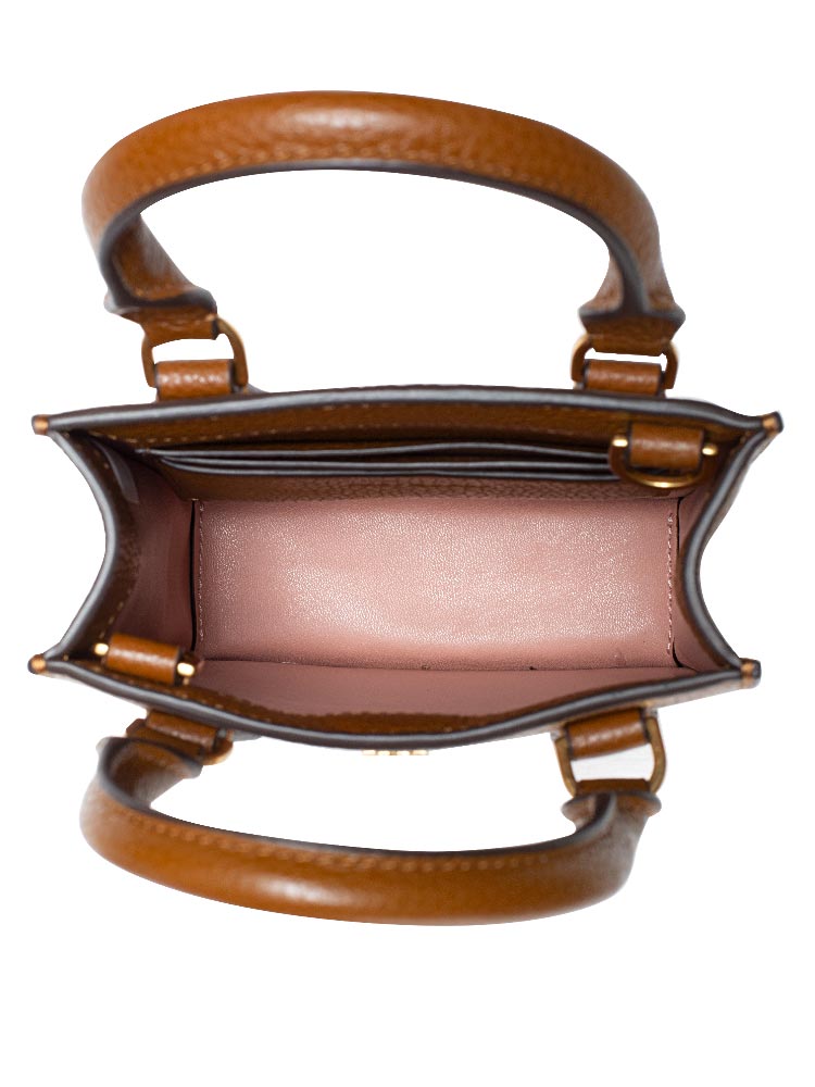 Made of pebbled leather. The bag features a Snap closure that opens to leather lining with three card slots, double handles drop 10 cm, adjustable and removable long strap.