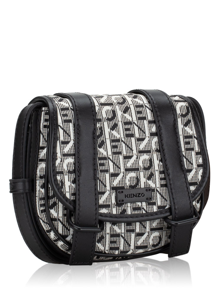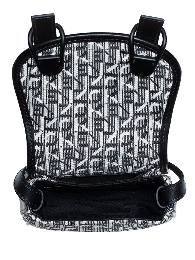 Crafted of jacquard with leather. It features a flap with magnetic closure, two main compartments, interior black leather slip pocket with embossed logo