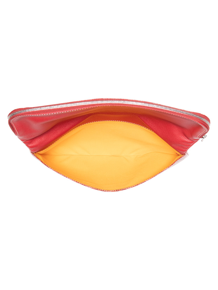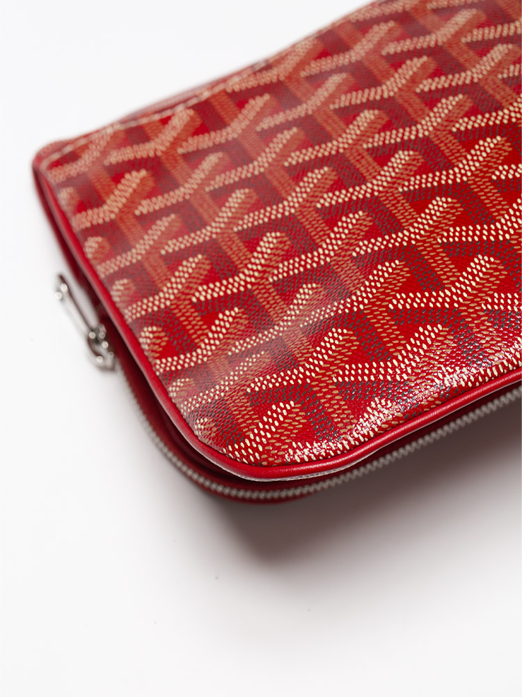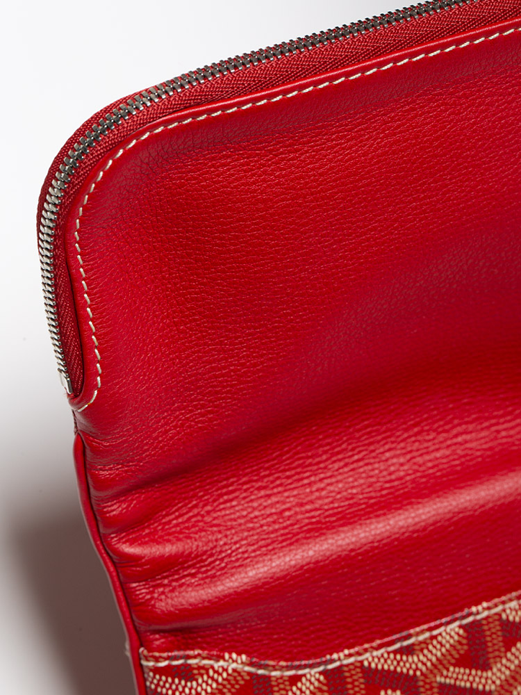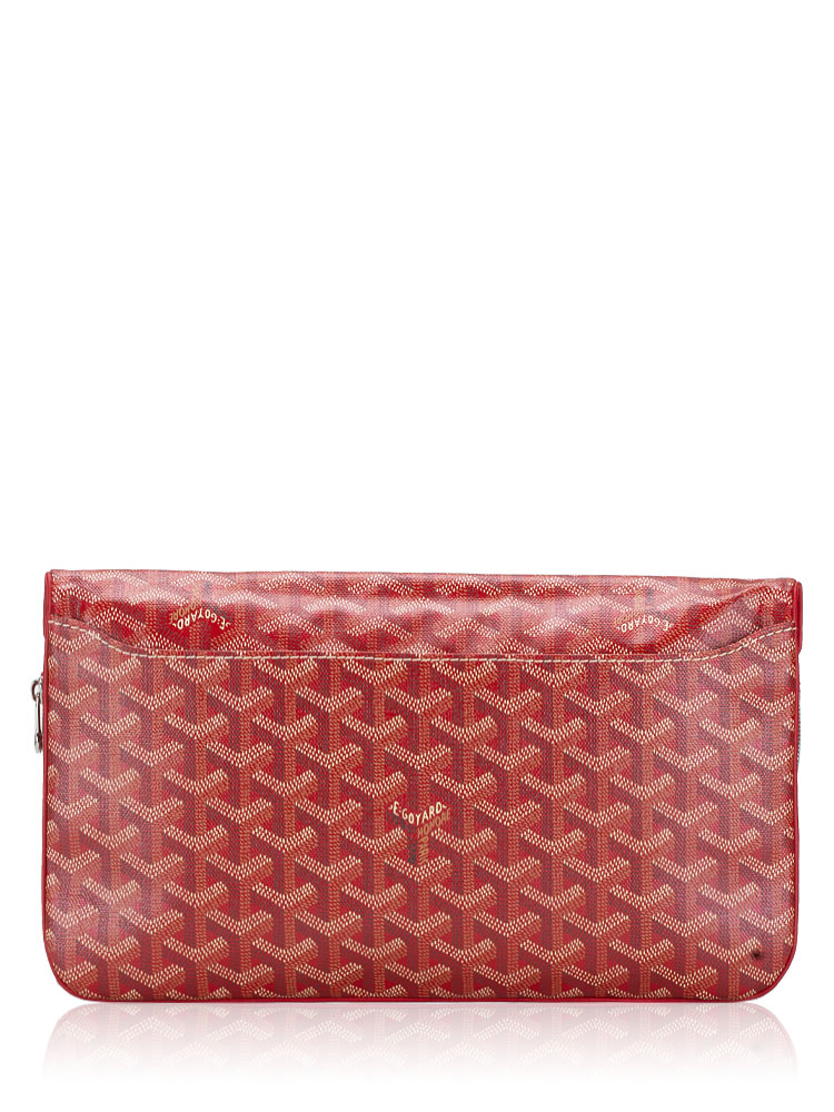 This clutch is crafted of classic Goyard chevron canvas. Features a rear patch pocket, and a facing flap with a calfskin leather panel and a silver wrap-around zipper. The flap opens to a fabric interior.