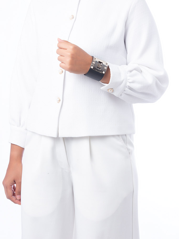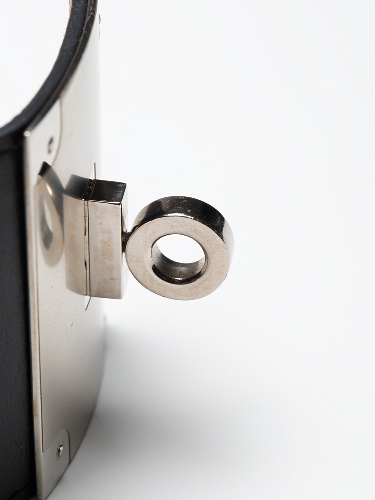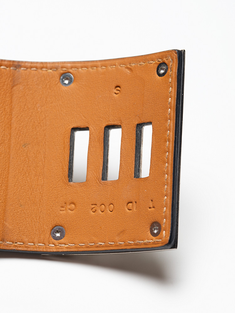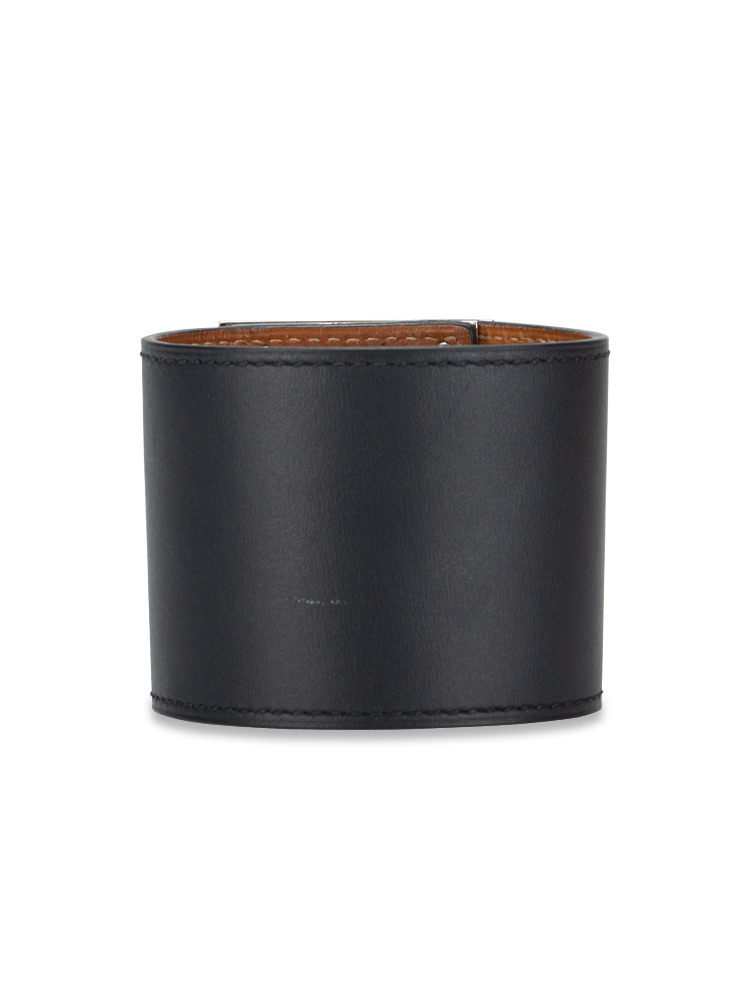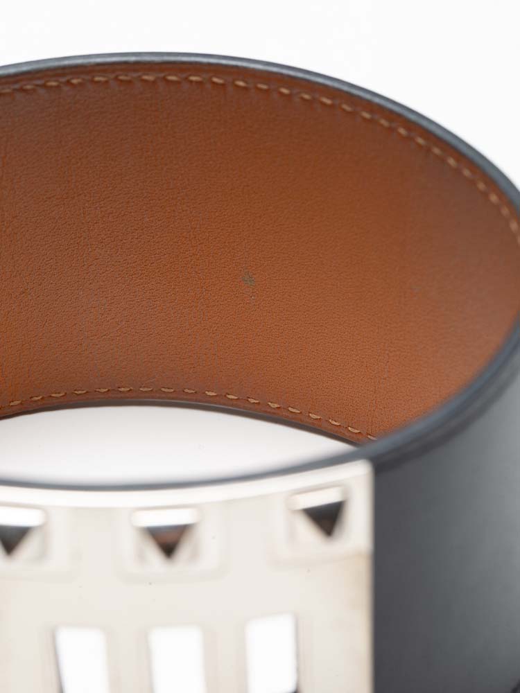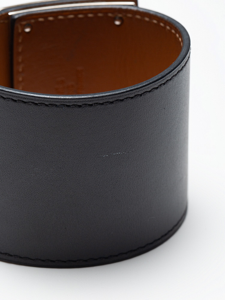 This bracelet is crafted of swift calfskin leather. The bracelet seals with a palladium silver plate with three adjustment notches and a round collar-like turn lock.