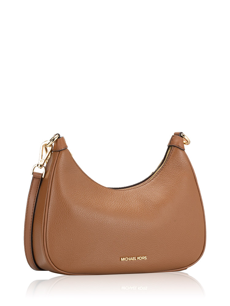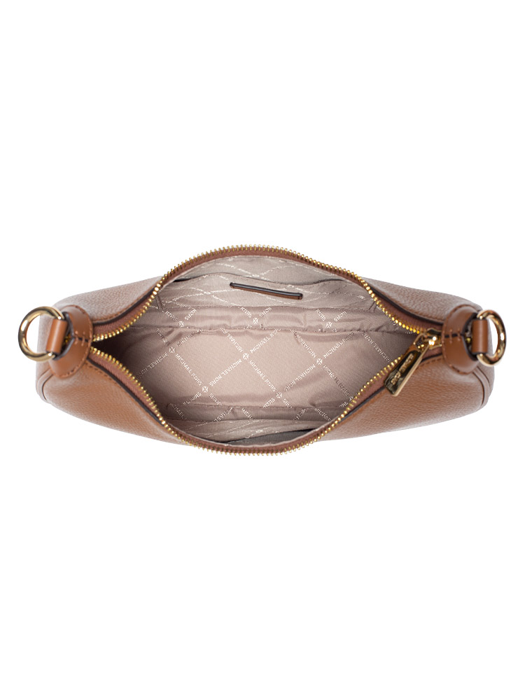 Made of pebble leather. The bag features a zip closure that opens to polyester lining with two slip pockets, removable chain strap, adjustable/removable long strap.