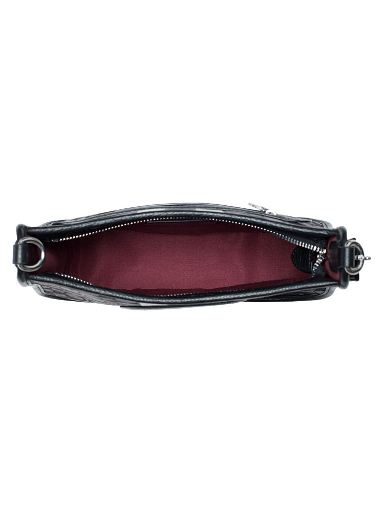 Signature jacquard and refined pebble leather. Inside multifunction pocket. Zip-top closure, fabric lining. Outside zip pocket. Detachable strap with 25 inc drop for shoulder or crossbody wear.