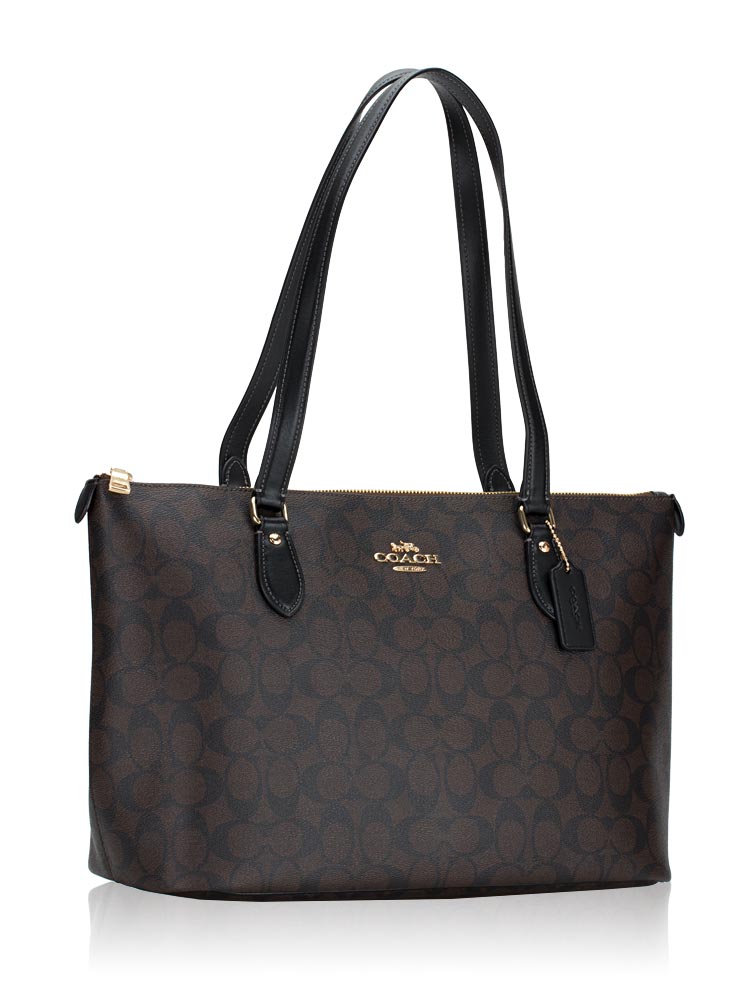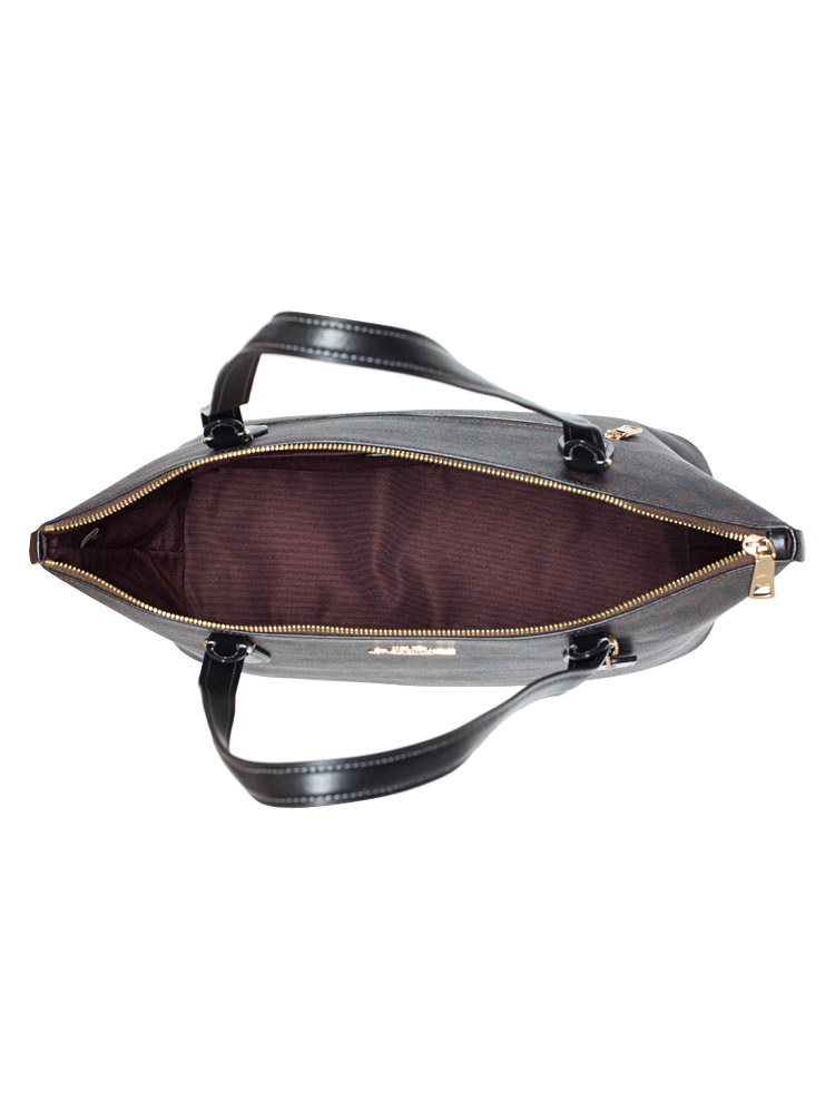Made of coated canvas. The bag features a zip closure that opens to fabric lining with two slip pockets, one zip pocket, exterior one zip pocket at back, double handles drop 30 cm.