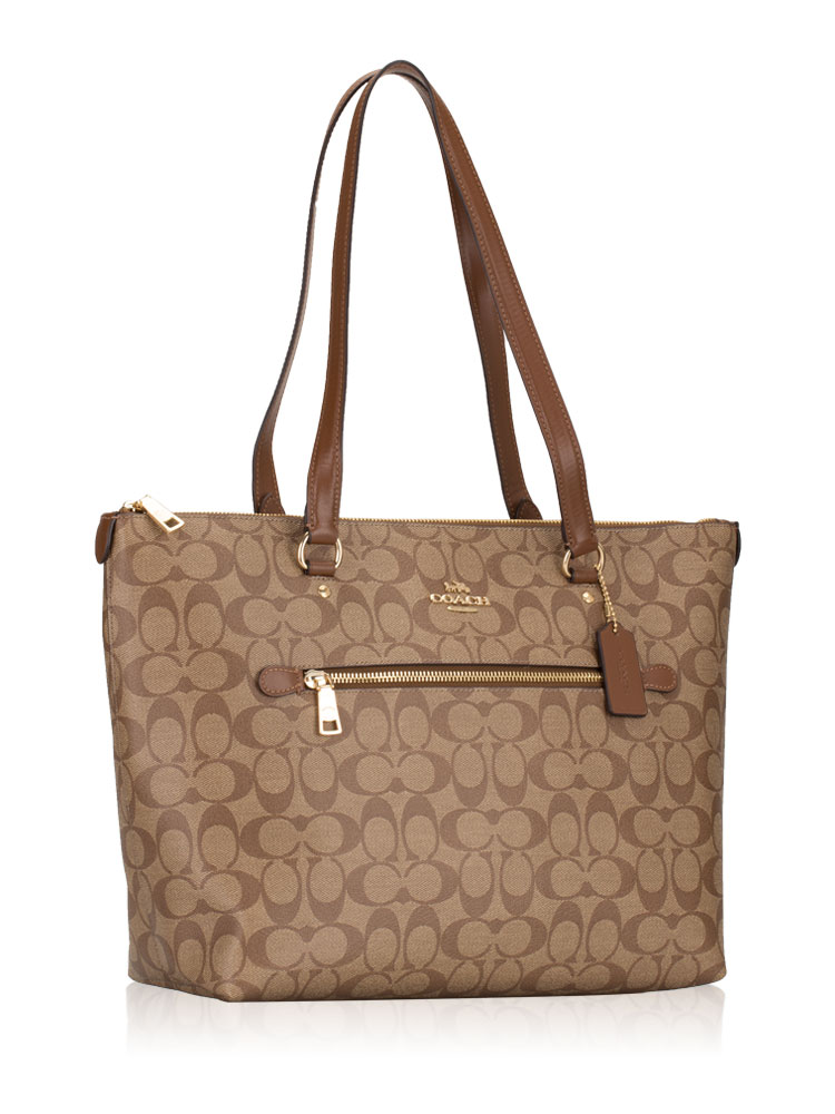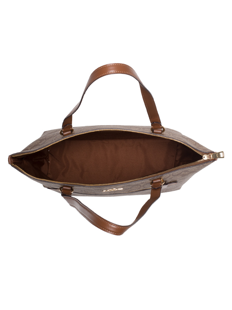 Crafted of signature coated canvas with leather trim, the bag features double handles, a zip closure that opens to a zip wall pocket and 2 slip wall pockets, also an exterior zip pocket at front side.