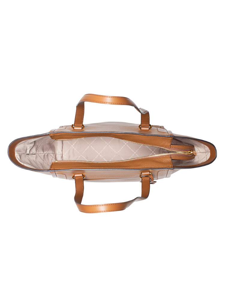 Made of pebbled leather. The bag features a zip closure that opens to polyester lining with interior one zip pocket, two slip pockets and at front one zip pocket.