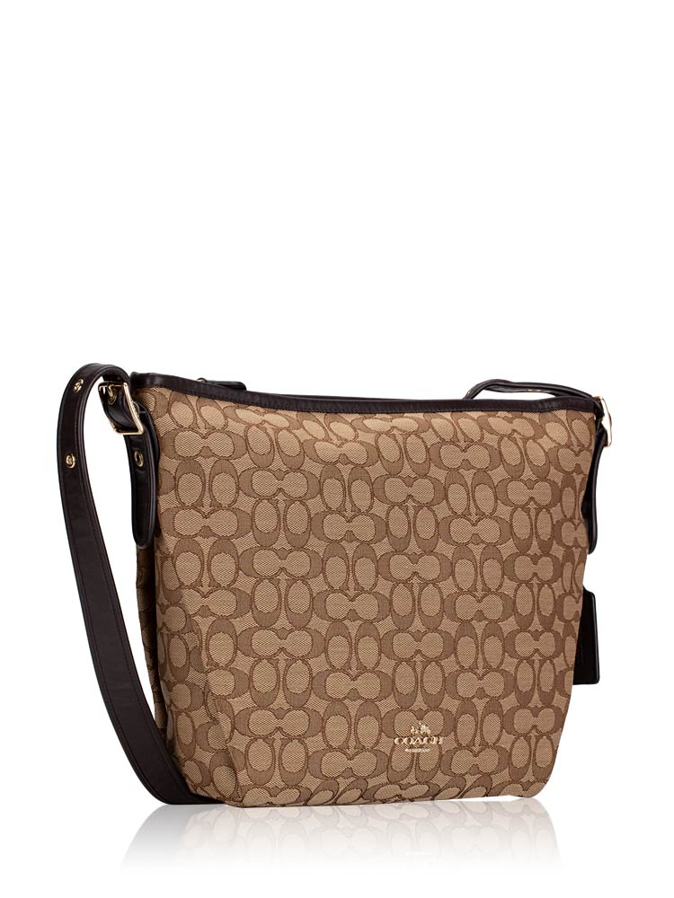 Made of canvas & leather. The bag features a zip closure that opens to fabric lining with two slip pockets, one zip pocket, adjustable and removable shoulder strap.