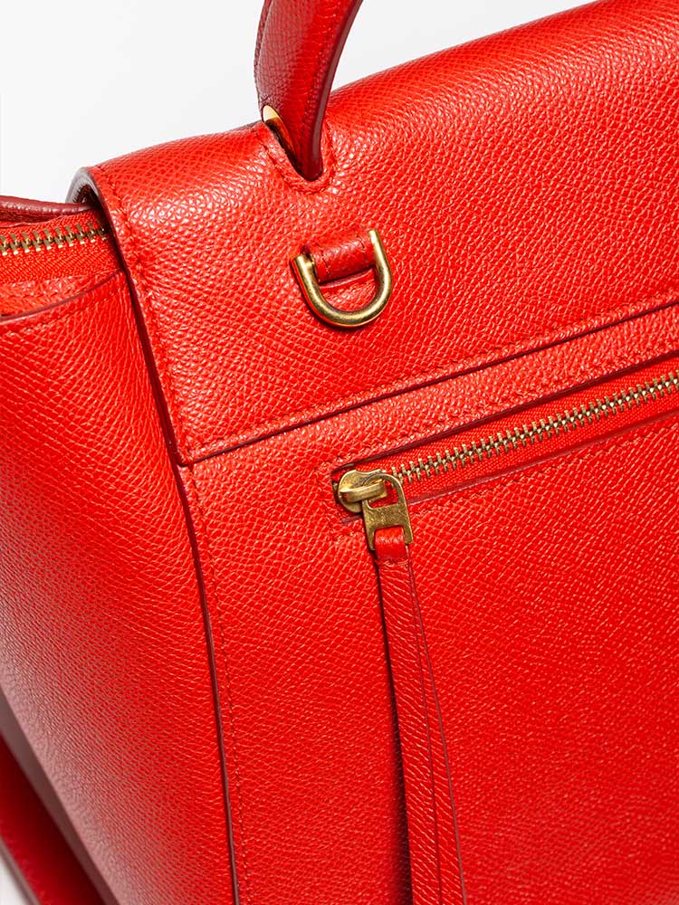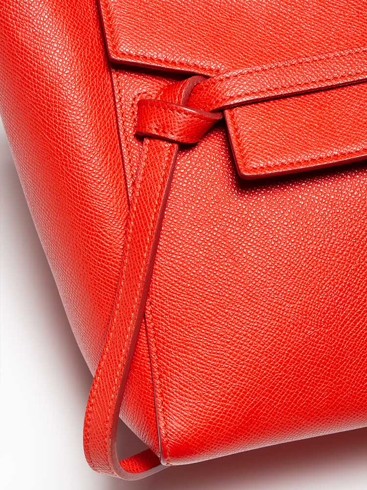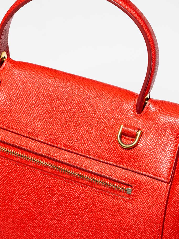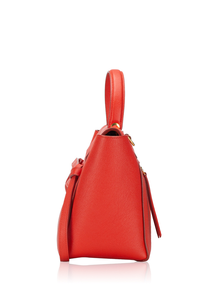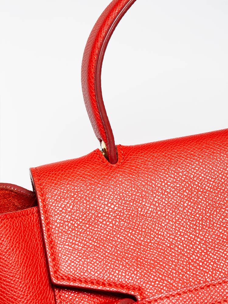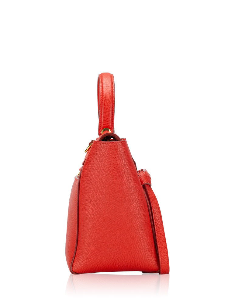 Crafted of grained calfskin leather. Features with a top handle, optional shoulder strap, and a front-facing flap that is secured by decorative knotted straps. The flap opens to a suede interior with a hanging patch pocket.