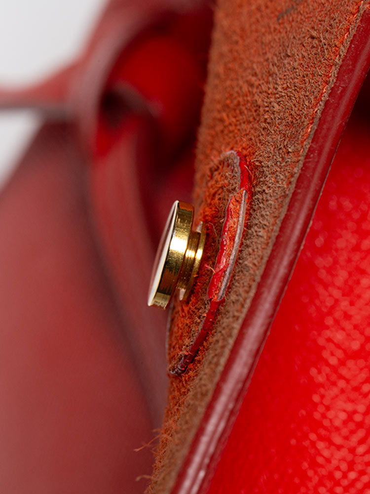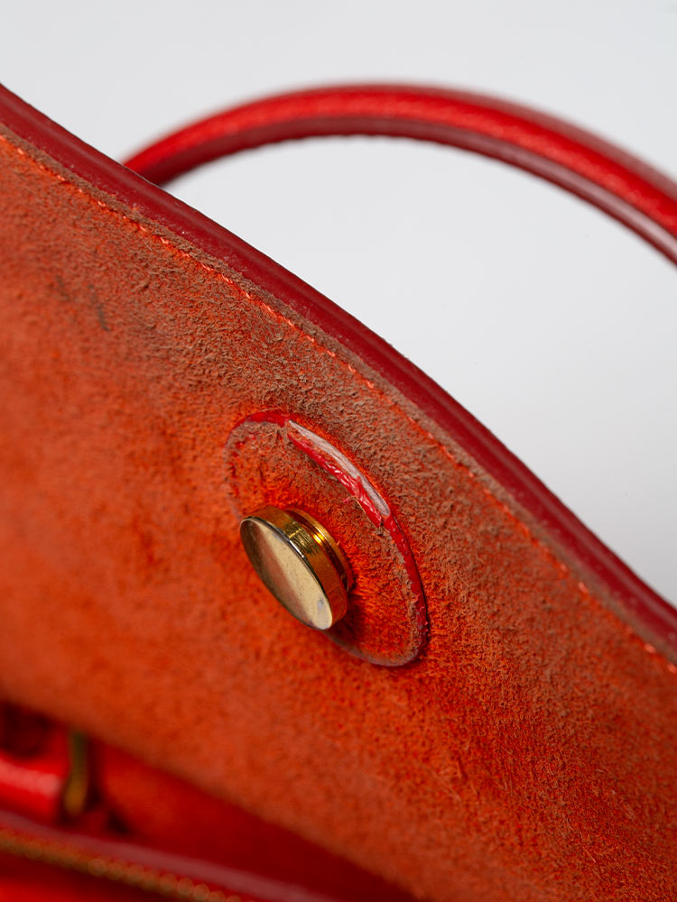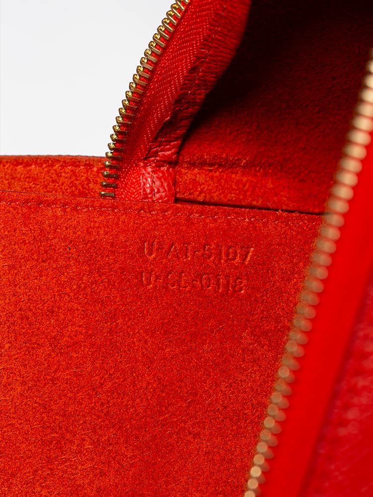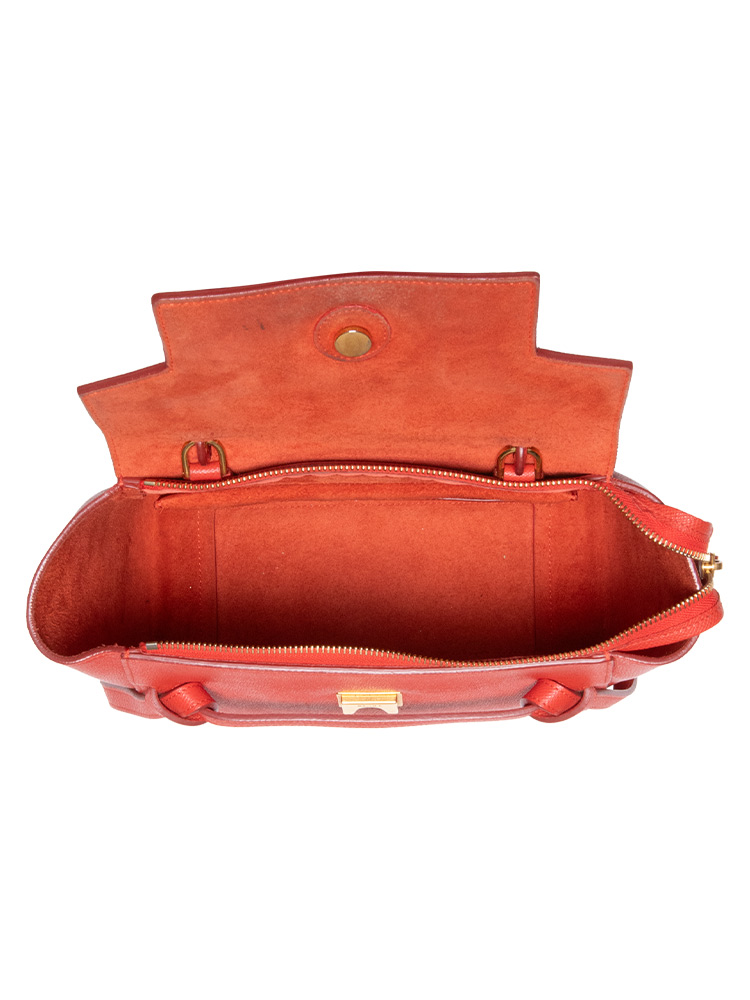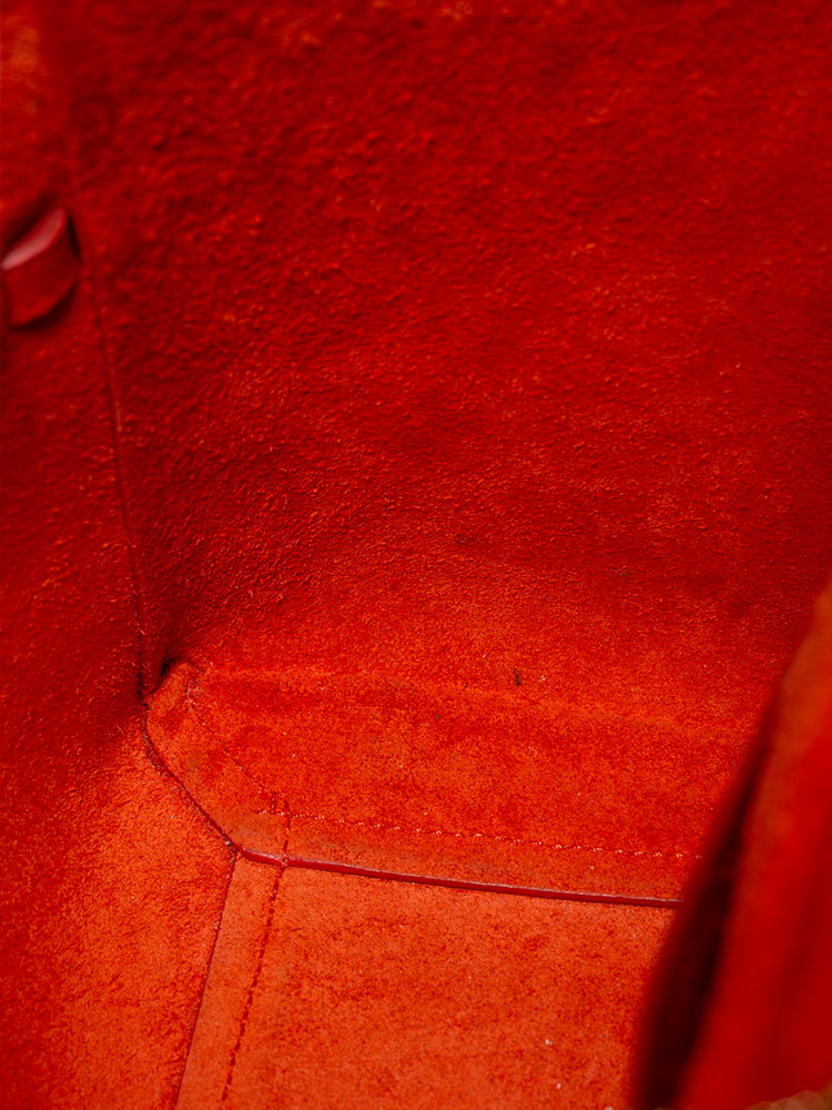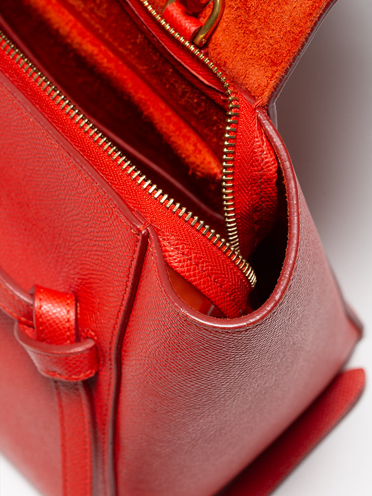 Crafted of grained calfskin leather. Features with a top handle, optional shoulder strap, and a front-facing flap that is secured by decorative knotted straps. The flap opens to a suede interior with a hanging patch pocket.