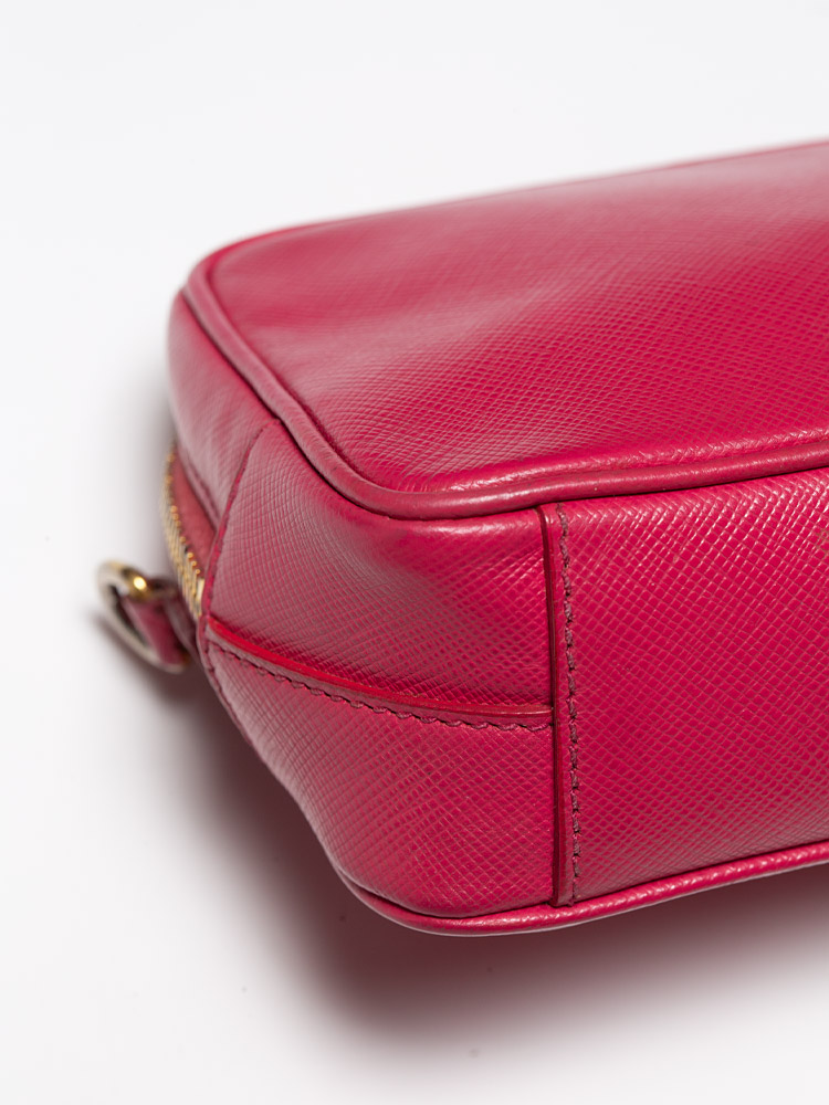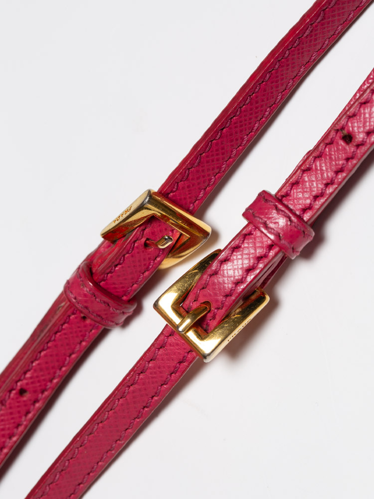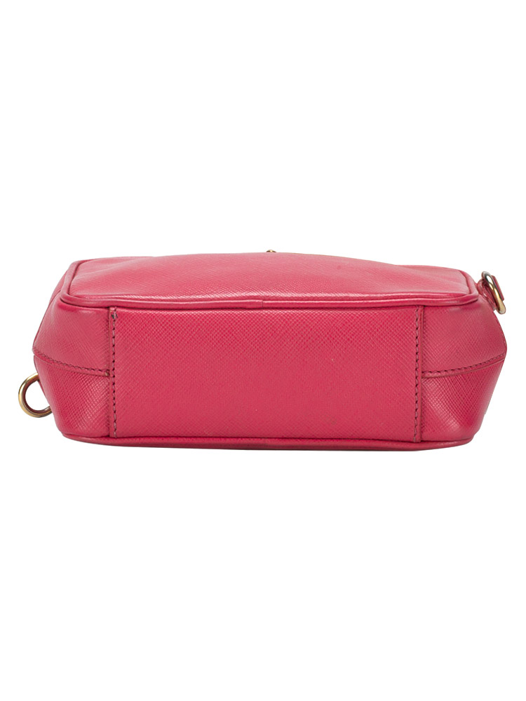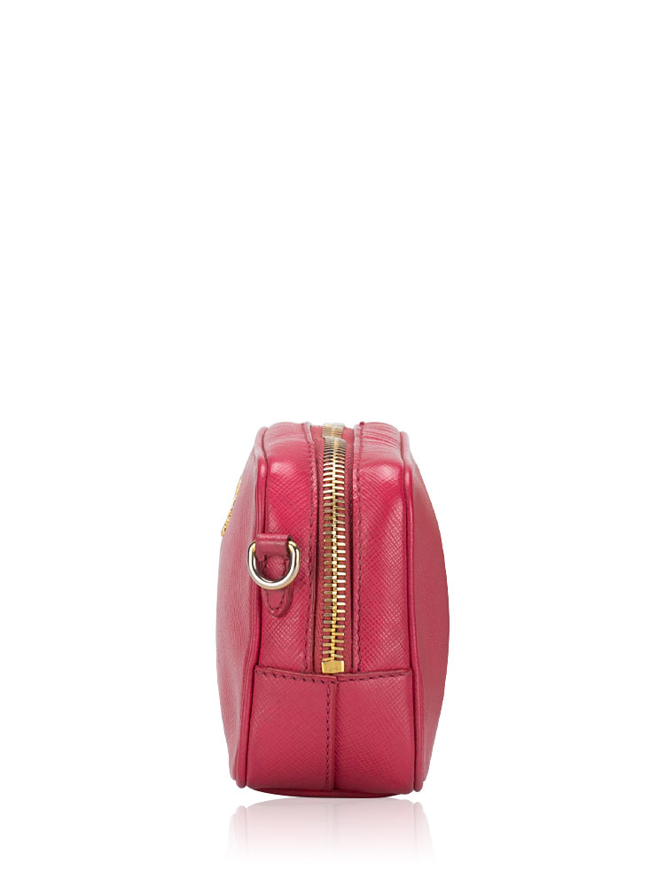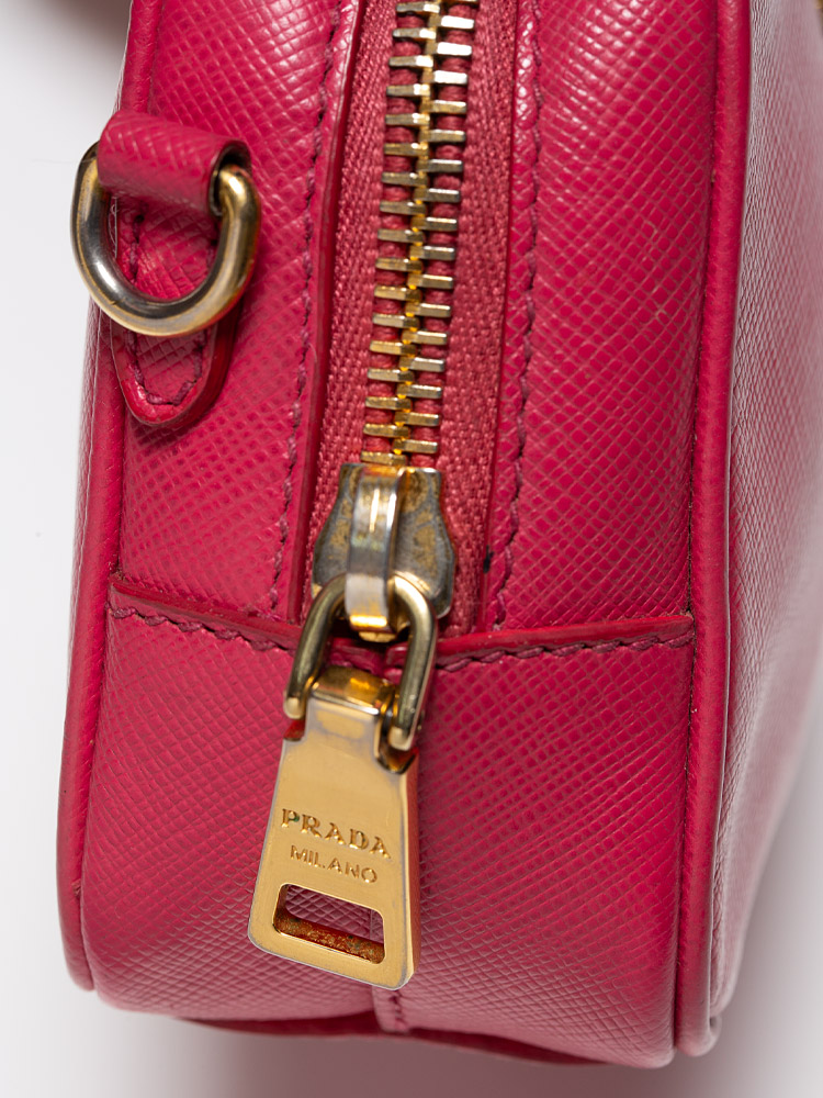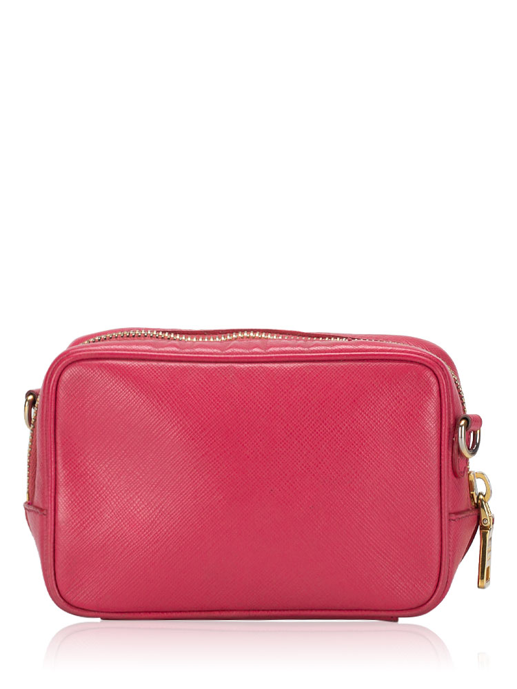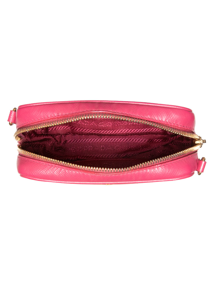 This crossbody bag is crafted of Prada signature cross-grained leather. Features an optional adjustable shoulder strap with polished gold buckles and gold clasps. The top zipper opens to a Prada fabric monogram interior with two patch pockets.
