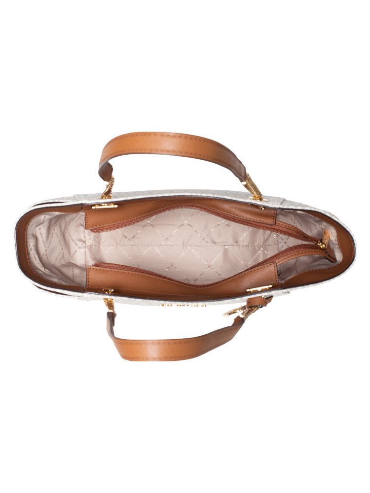 Crafted of signature coated canvas with saffiano leather trim. The bag features double chain handles, a zip closure, a polyester lining with a zip pocket and two slip pockets inside. It also has two exterior side pockets.