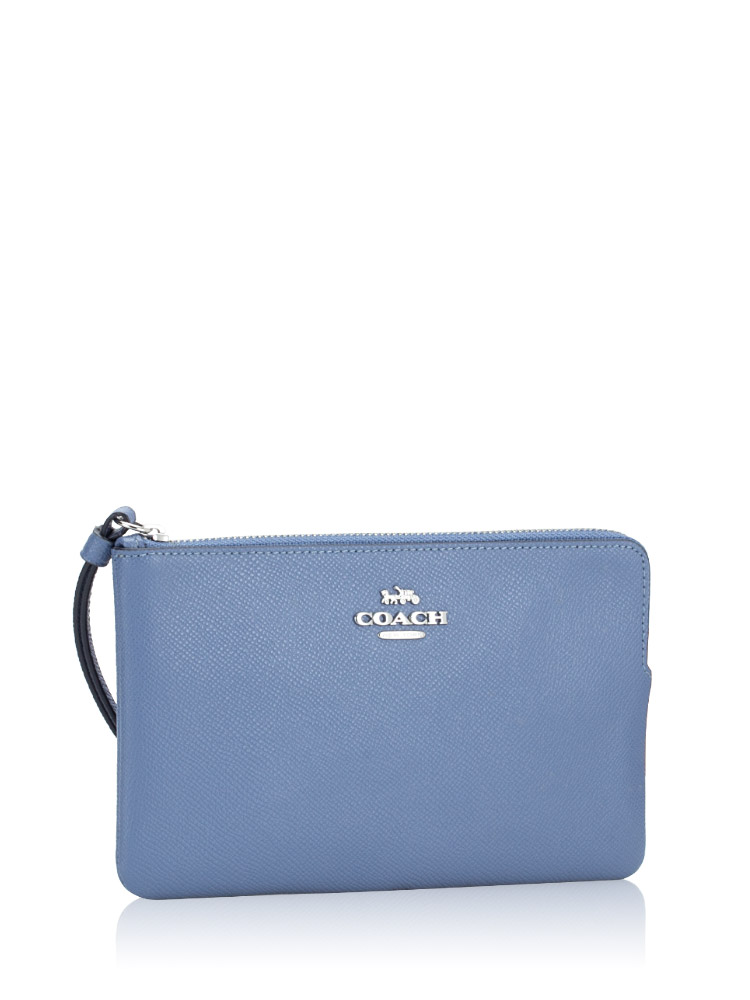 Crafted from crossgrain leather, it features an attached wrist strap. The zip closure opens to fabric lining with card slots.