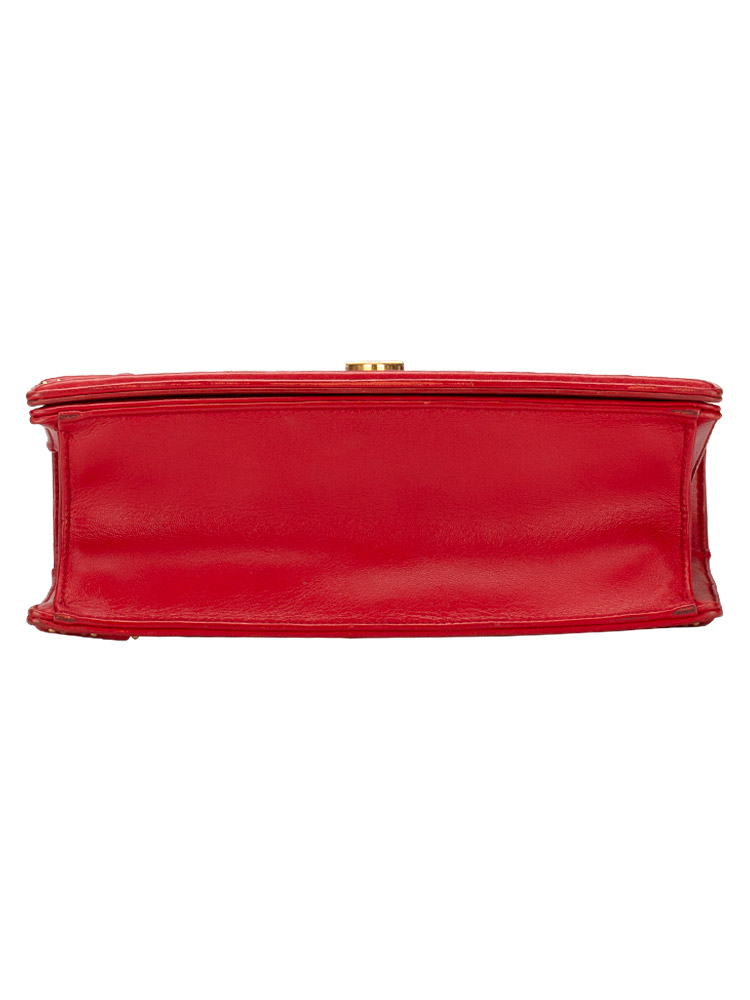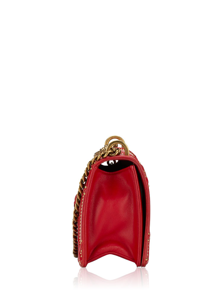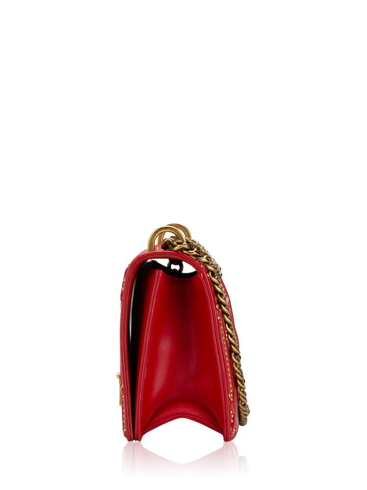 Crafted of soft lambskin leather with a large sized geometric ribbing embellished with gold studs. The shoulder bag features an aged gold chain with leather shoulder pad and an aged gold press lock. The flap opens to a matching fabric interior.