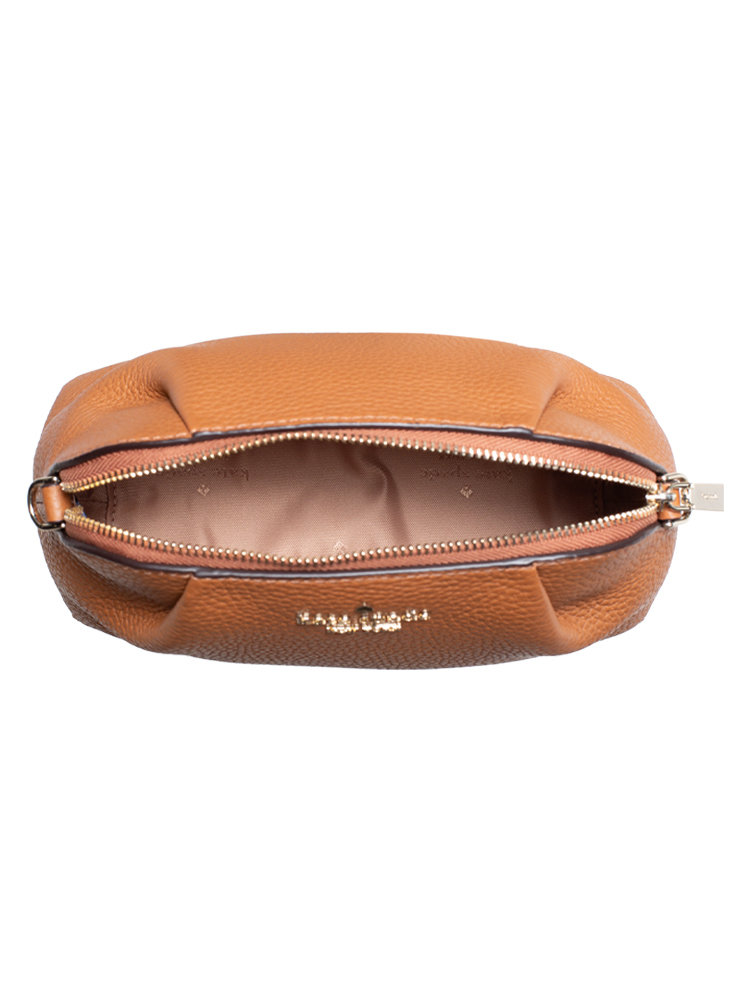 Made of pebble leather. The bag feature a zip closure that opens to fabric lining with interior three card slots, removable wrist strap, adjustable and removable long strap.
