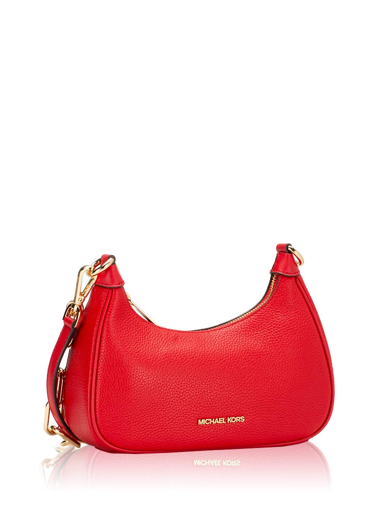 Made of pebble leather. The bag features a zip closure that opens to polyester lining with interior three card slots, removable chain strap, adjustable and removable long strap.
