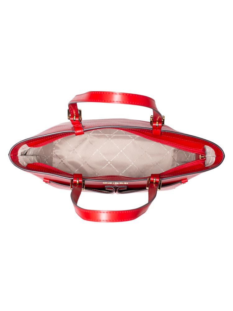 Made of pebble leather. The bag features a zip closure that opens to polyester lining with interior one zip pocket and exterior two slip pocket at front.