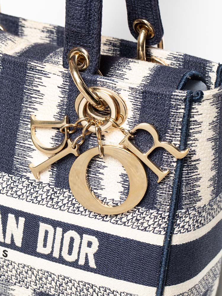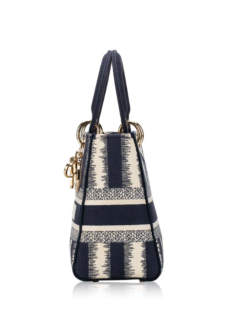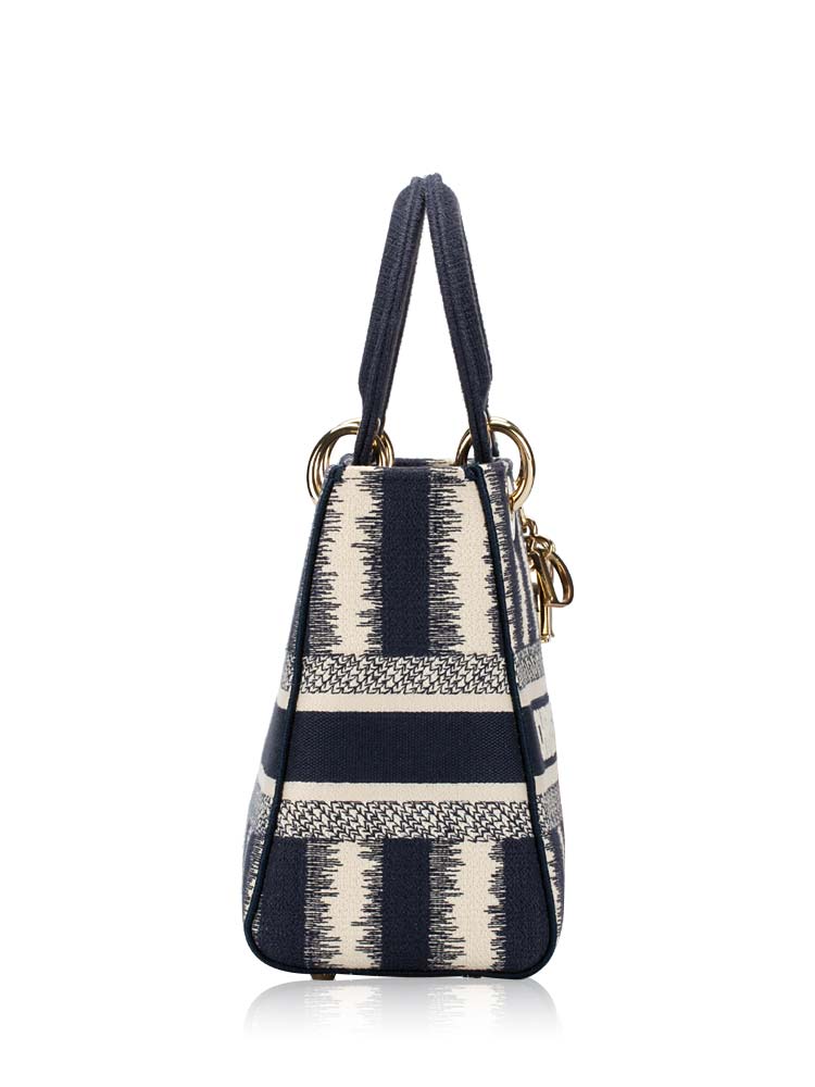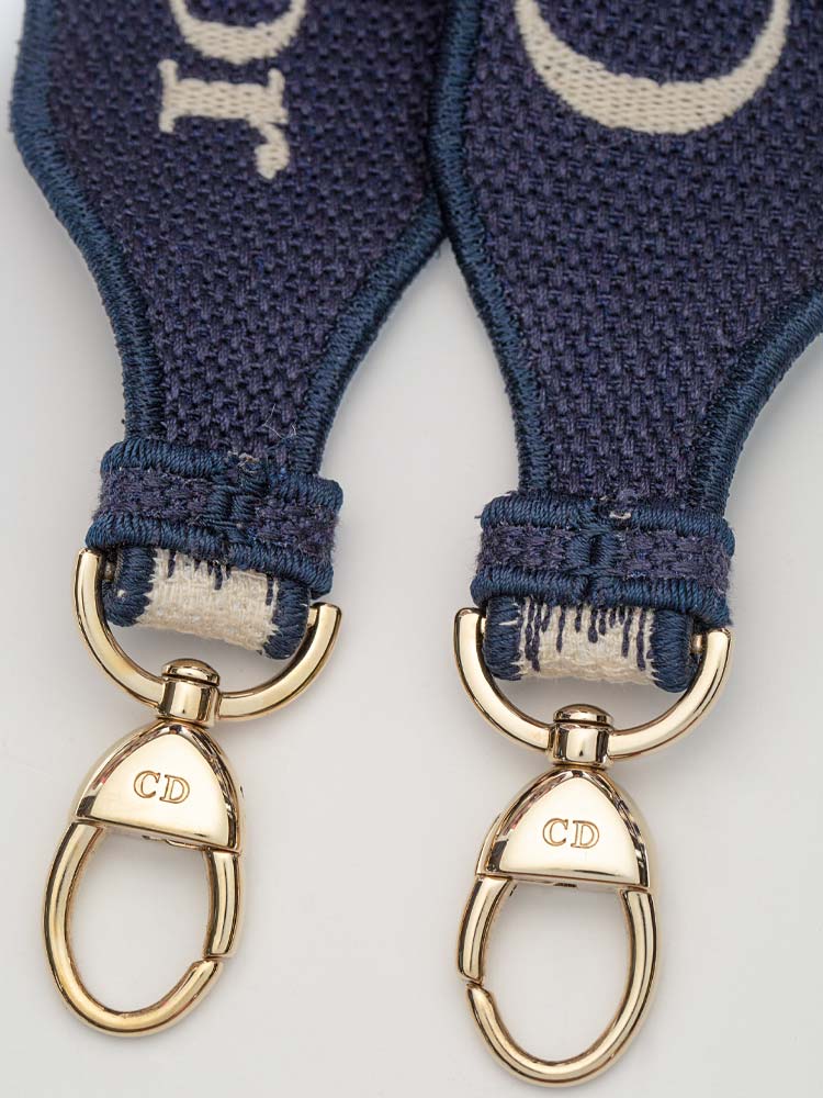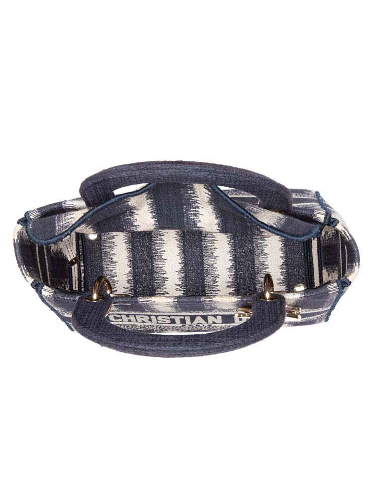 This bag is crafted of embroidered blue Cannage canvas with a 'Christian Dior' signature on the front. Features fabric top handles and shoulder strap with gold hardware, including a Dior letters charm.