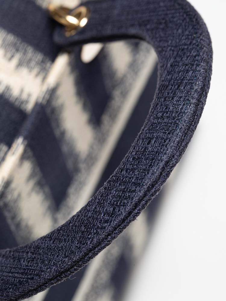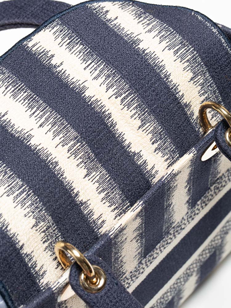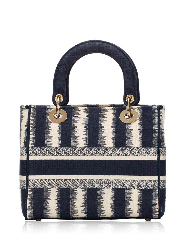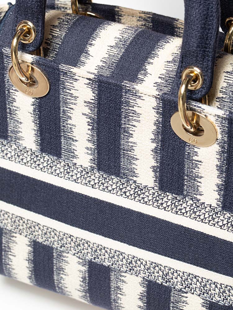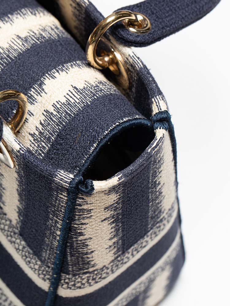 This bag is crafted of embroidered blue Cannage canvas with a 'Christian Dior' signature on the front. Features fabric top handles and shoulder strap with gold hardware, including a Dior letters charm.