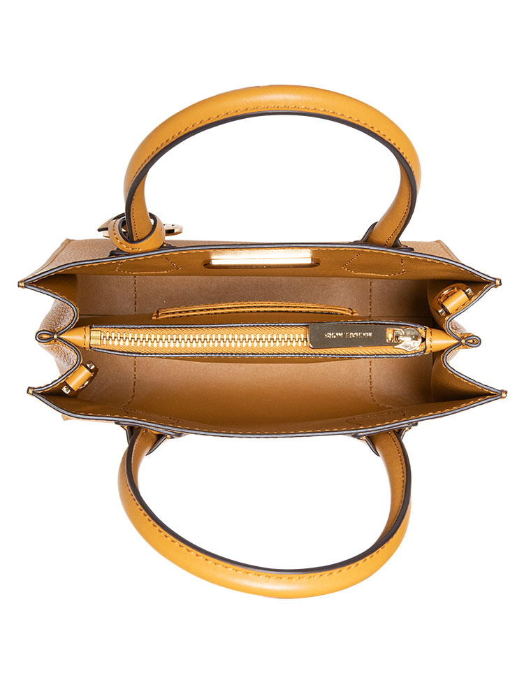 Crafted of pebble leather, the bag features double handles, open top that leads to double compartments divided by middle zip pocket, saffiano and polyester lining, 3 card slots, and an optional long strap.