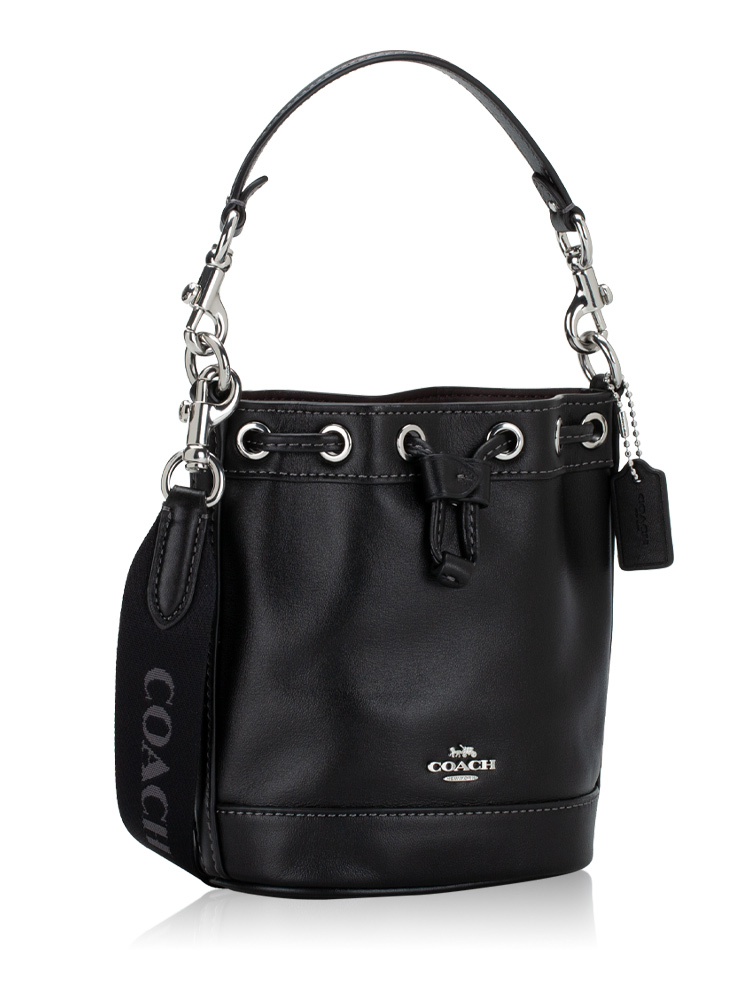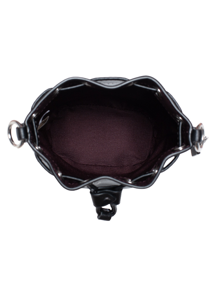 Made of smooth leather. The bag features a drawstring closure that opens to fabric lining no interior, adjustable and removable long strap.