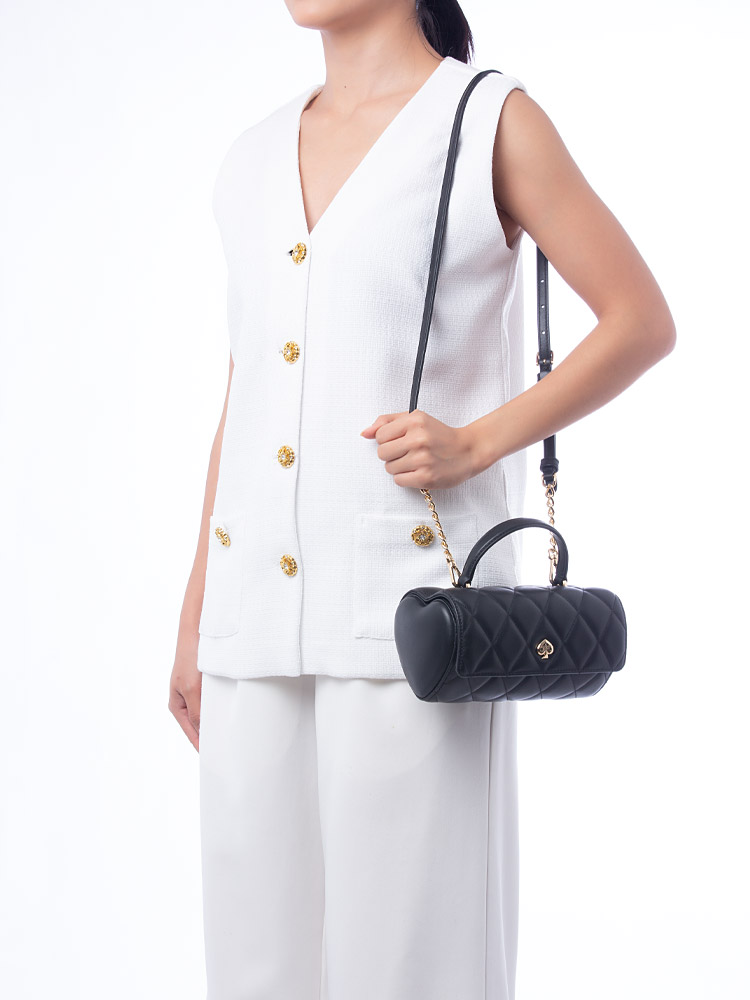 Made of smooth quilted leather. The bag features a magnetic closure that opens to two way script logo lining.