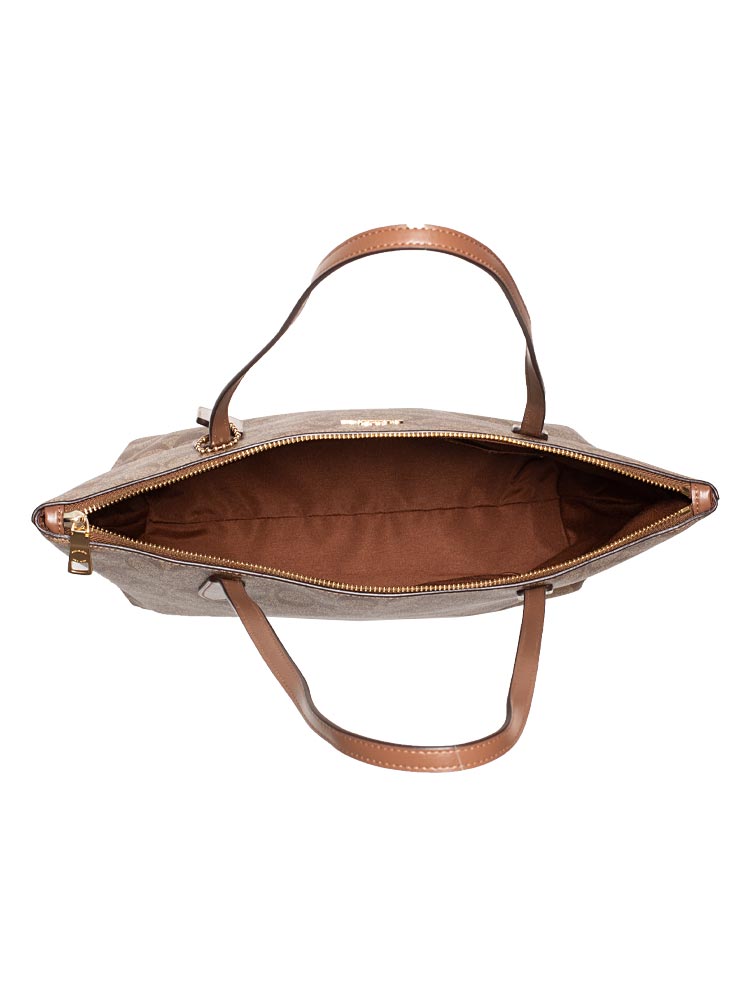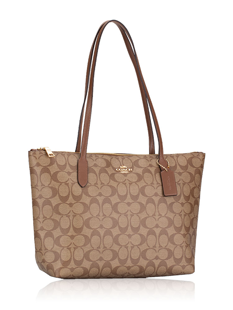 Made of signature coated canvas and smooth leather, also accented with gold-tone hardware. This tote bag features a zip closure that opens to a matching fabric lining with three slip pockets.