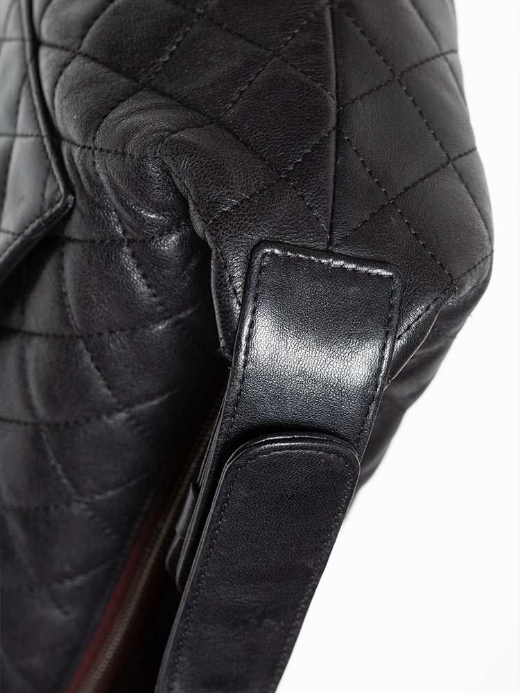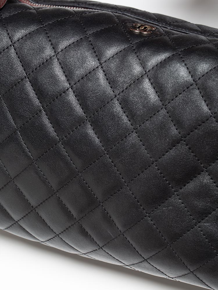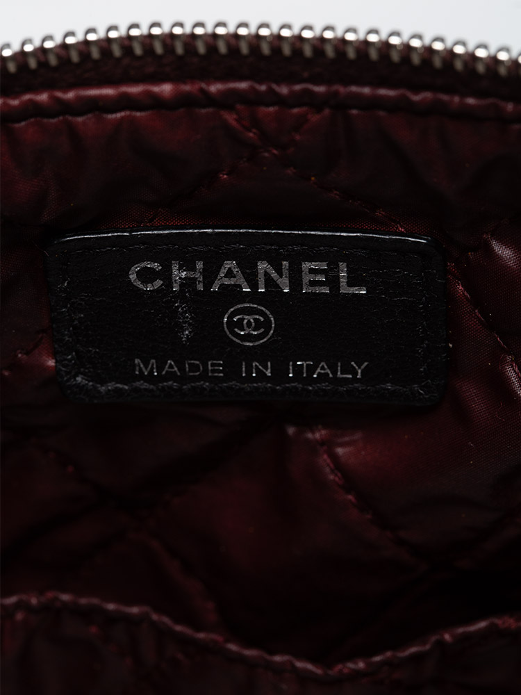 Crafted of quilted lambskin leather with a small cc logo on the front. The top zip opens to a nylon lining with a patch pocket.
