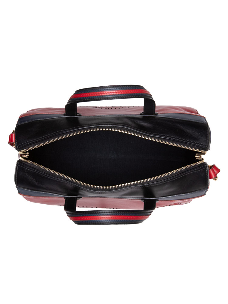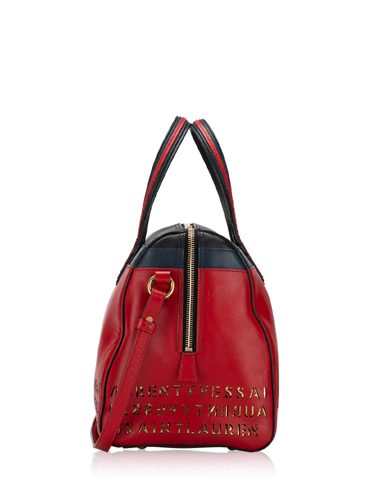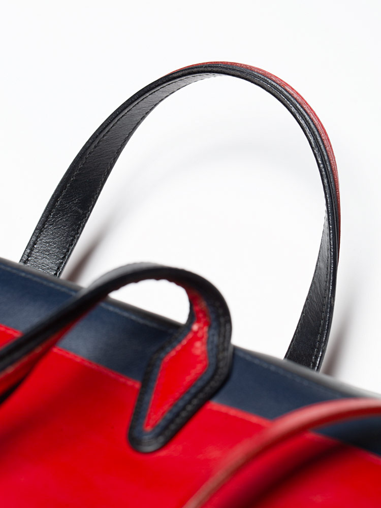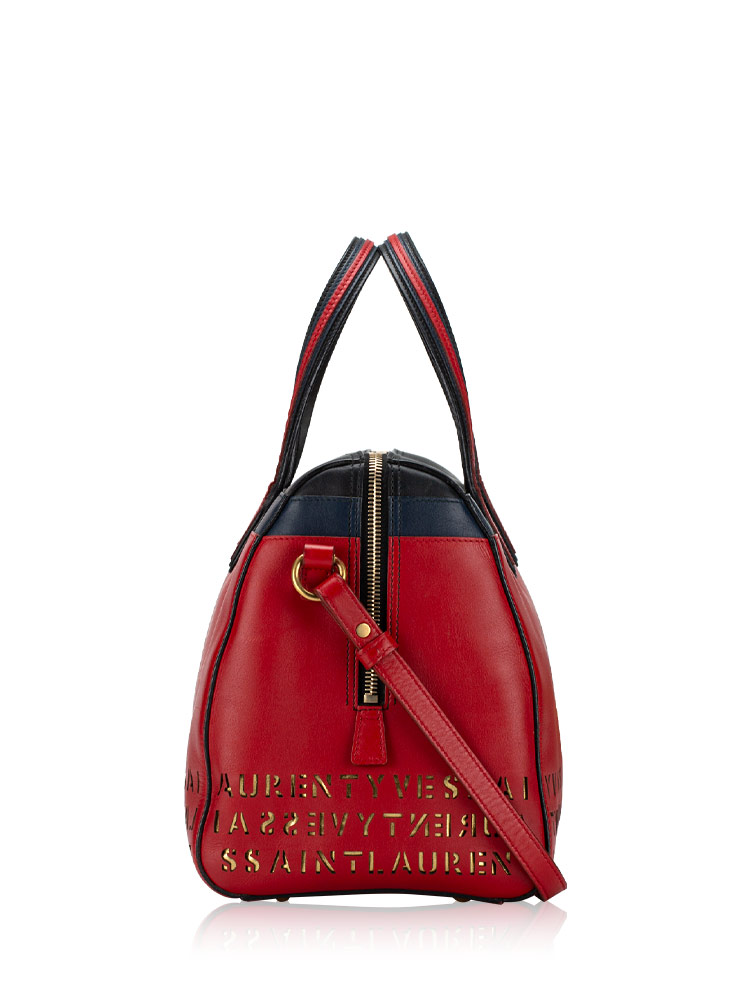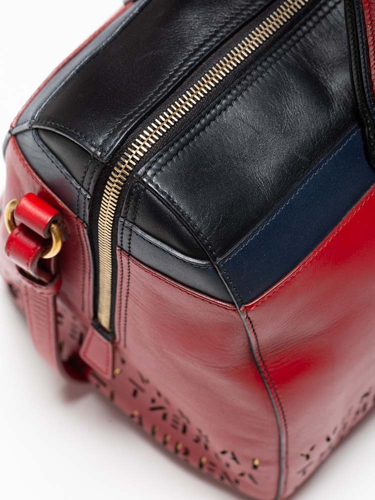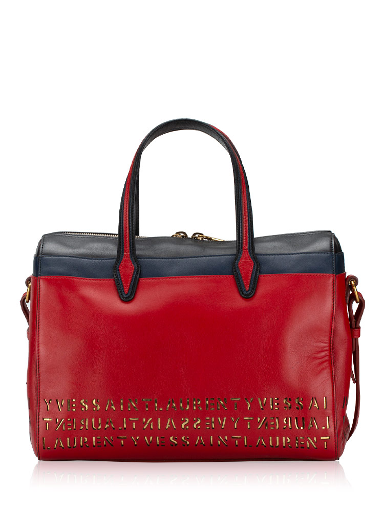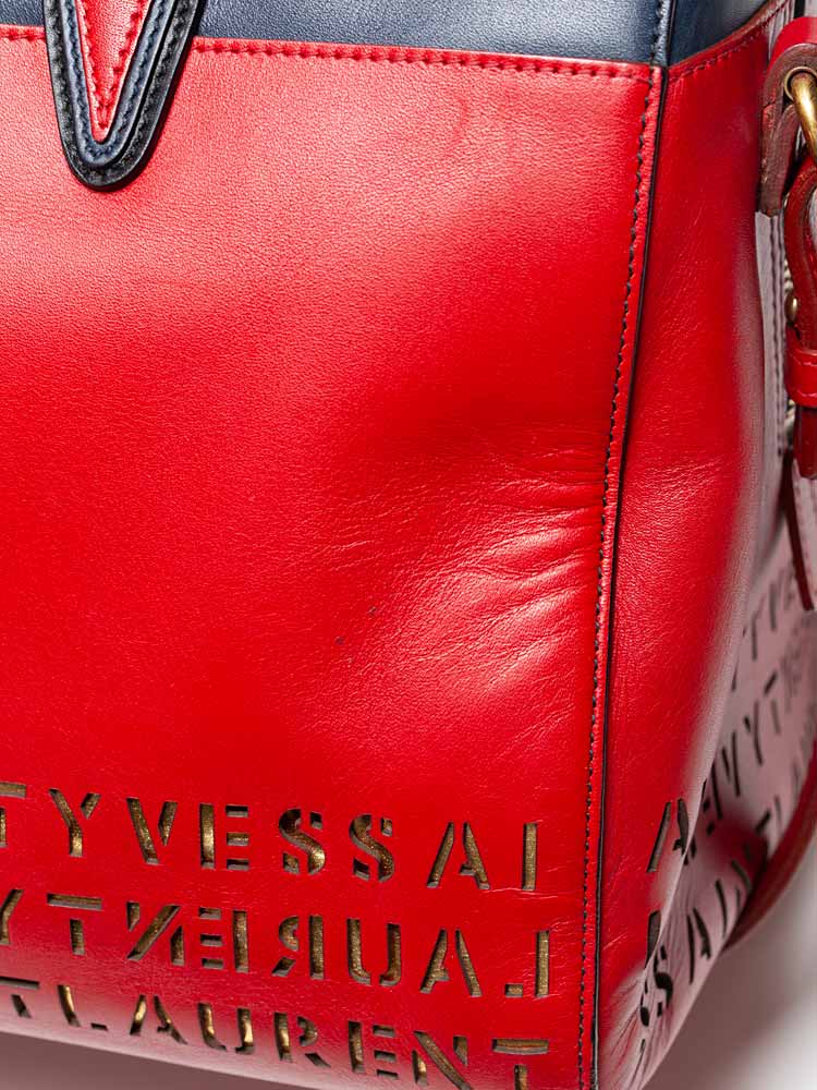 This tote is crafted of polished smooth leather with poppy red for the main body and navy blue and black at the top crest. The striking feature includes the cut out logo lettering with gold leather inlay.