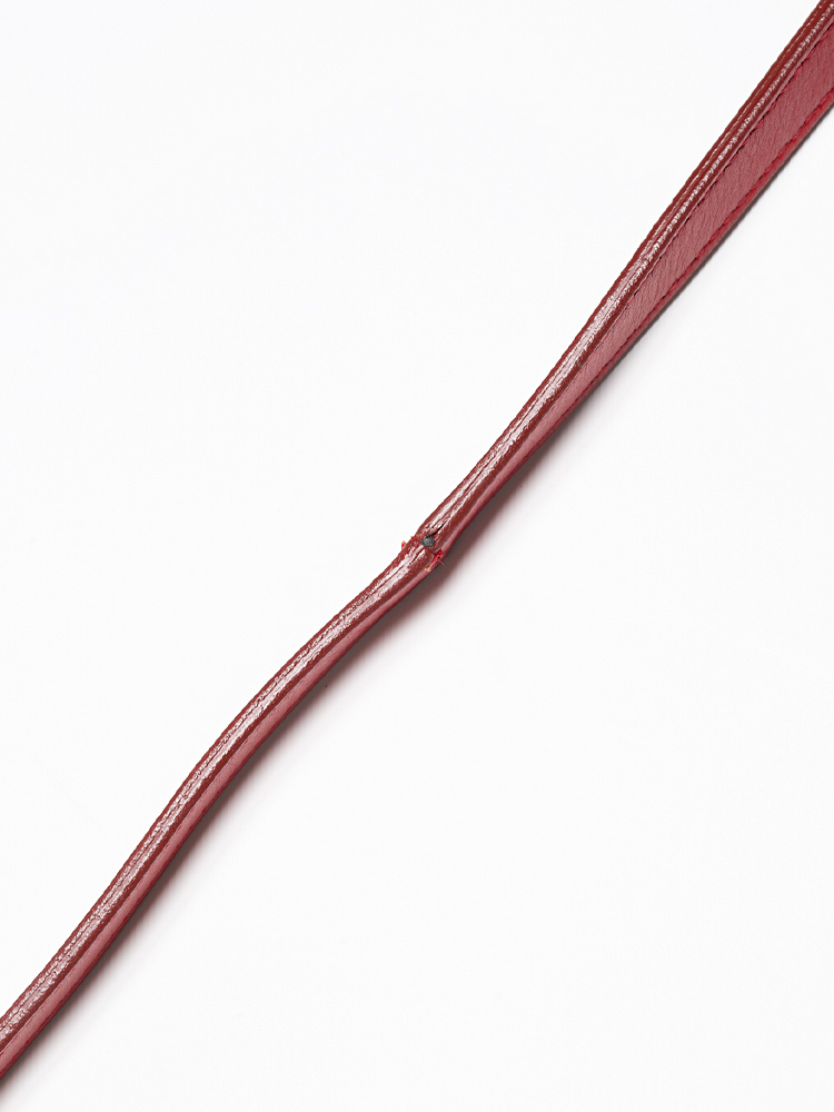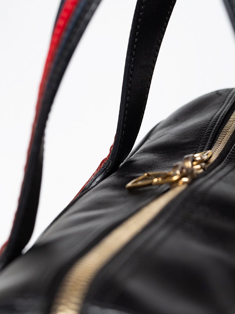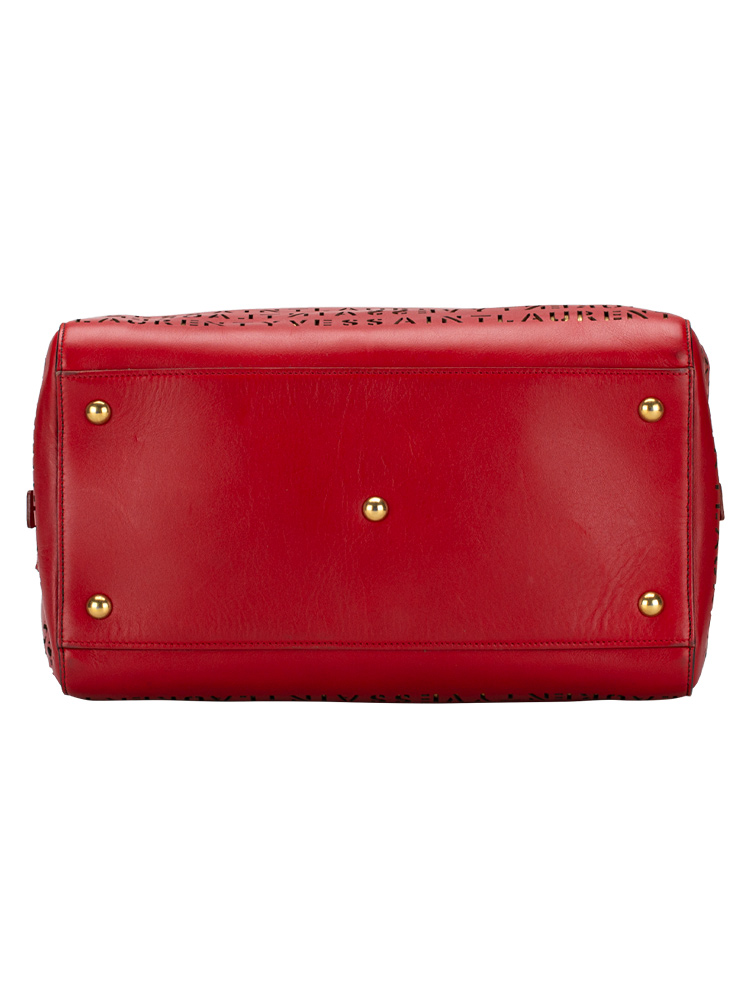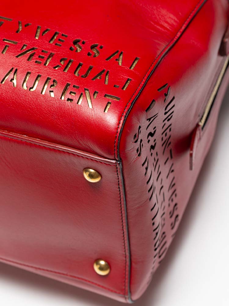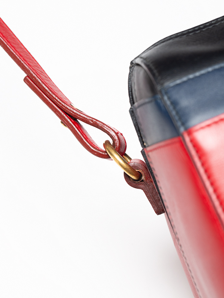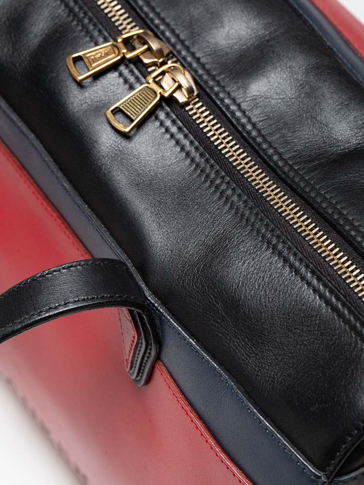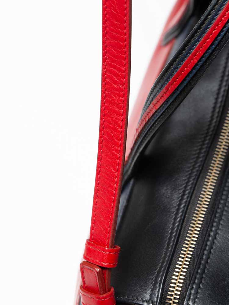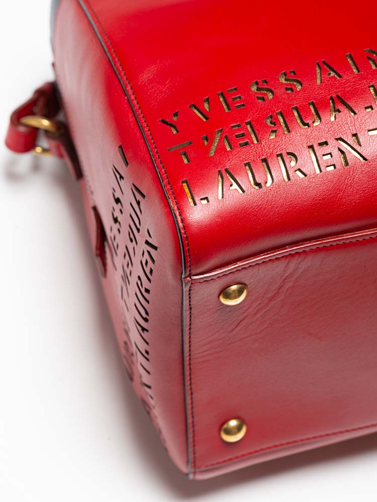 This tote is crafted of polished smooth leather with poppy red for the main body and navy blue and black at the top crest. The striking feature includes the cut out logo lettering with gold leather inlay.