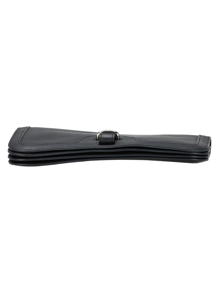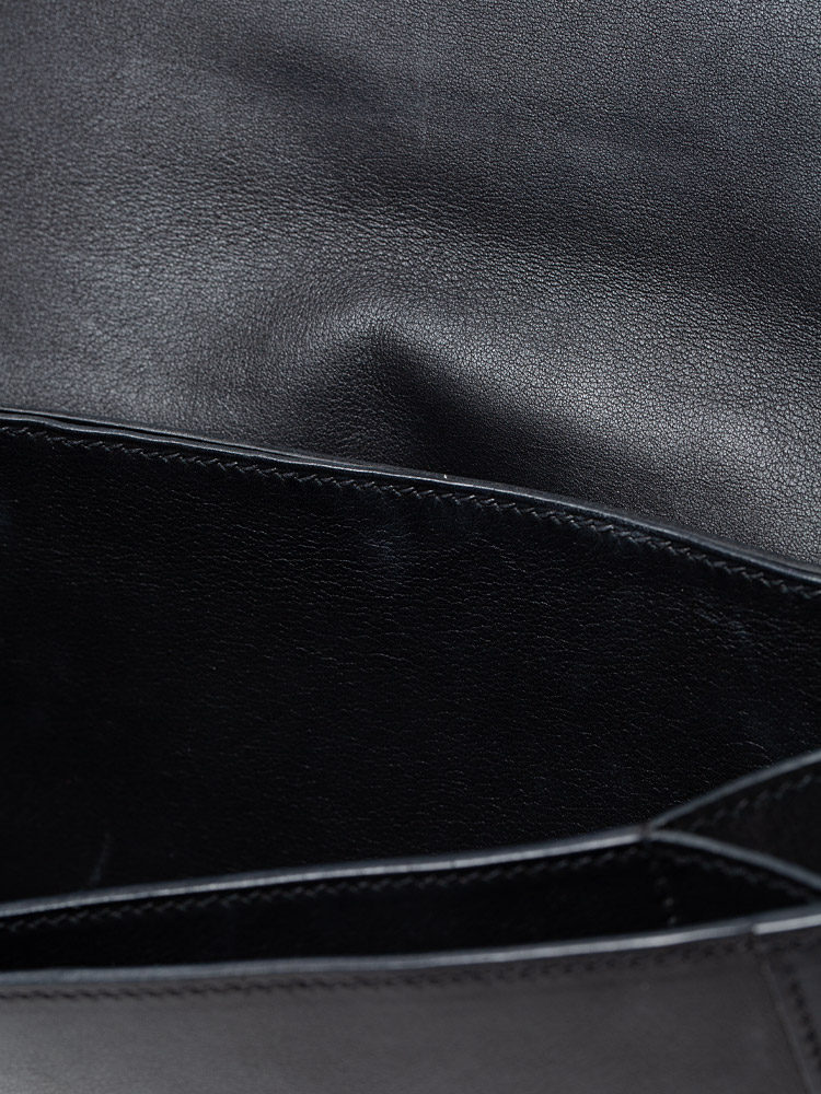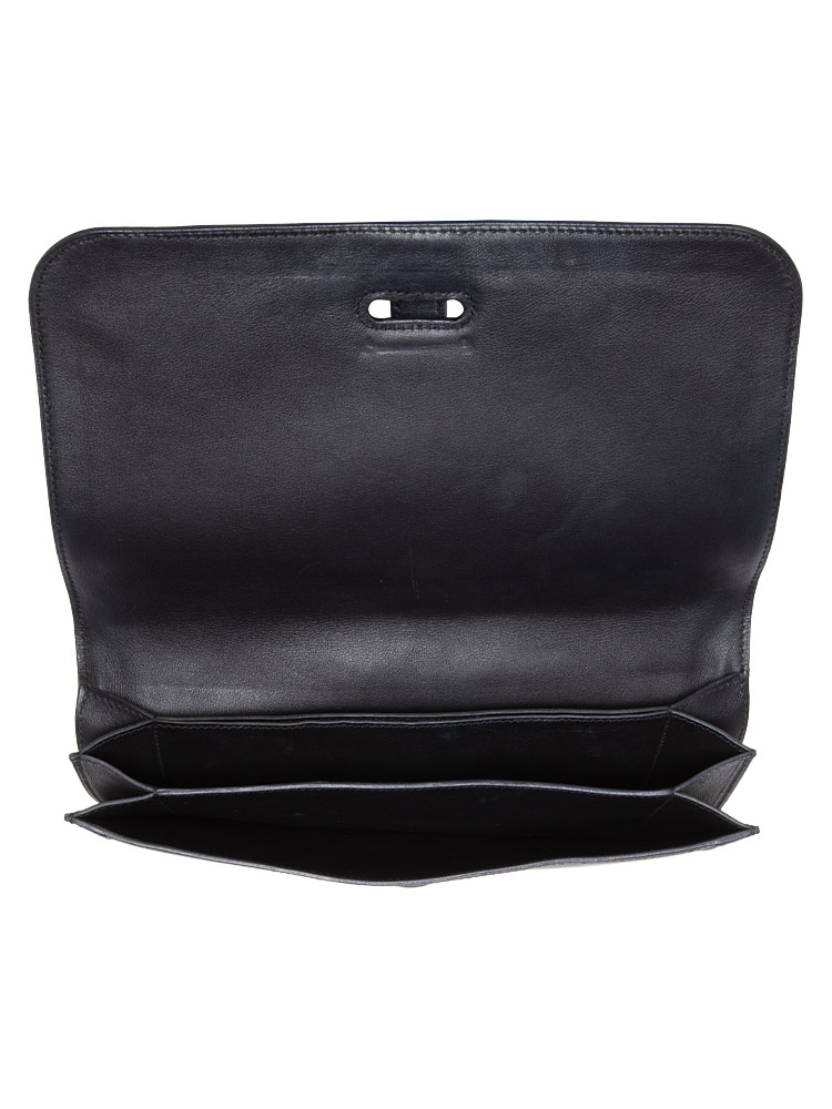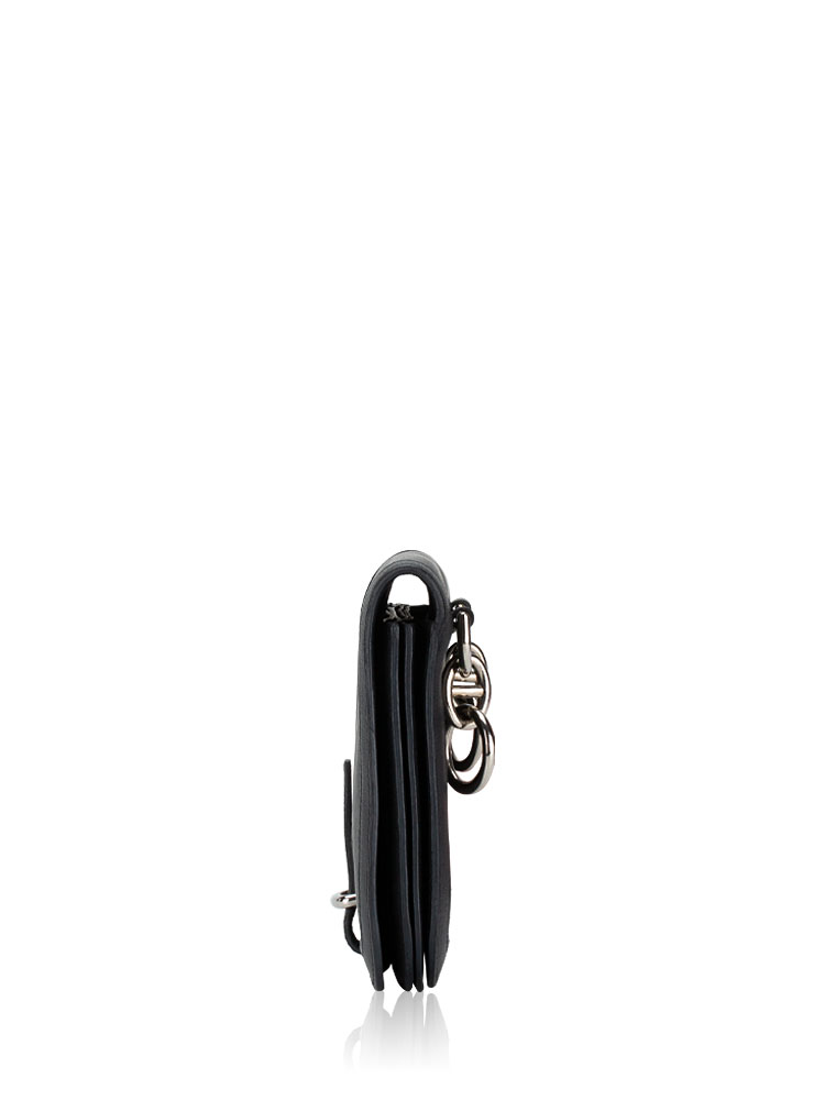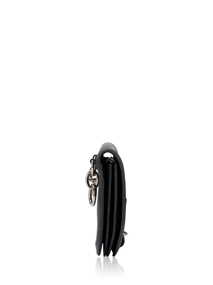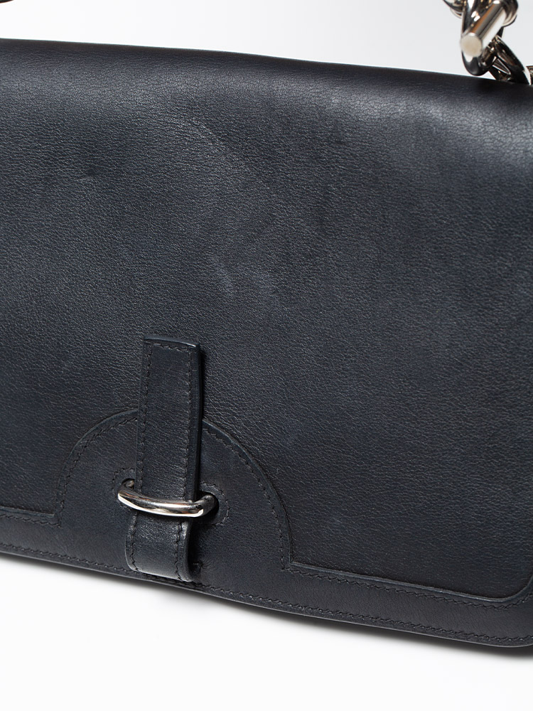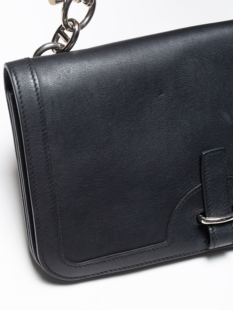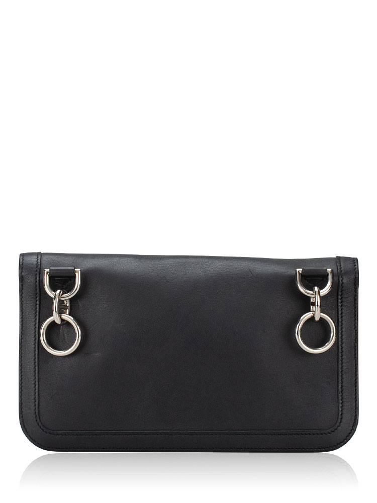 Crafted of swift leather material. It features an optional chain shoulder strap. The crossover flap secures with a matching silver stylized cross bar, and opens to a partitioned leather lining with slip pocket.