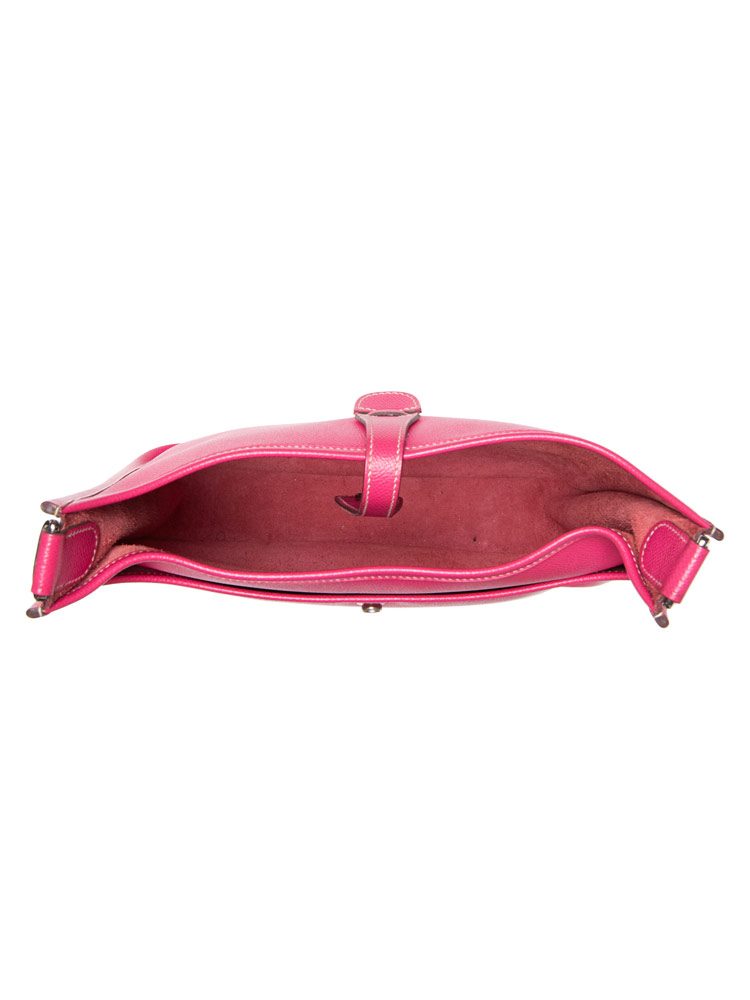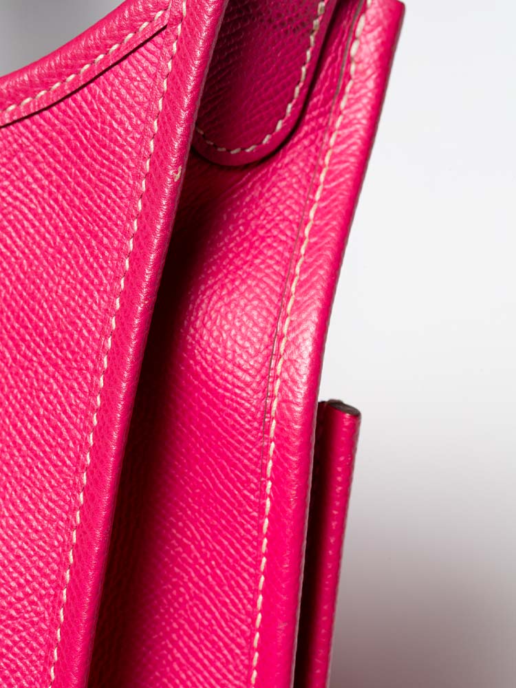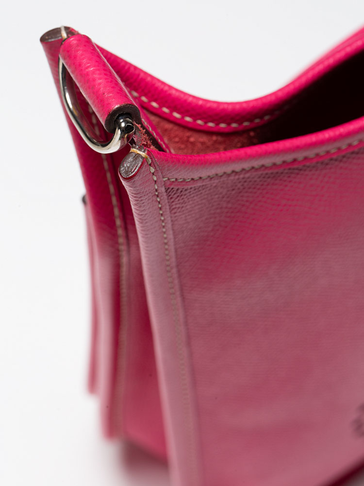This bag has a tall shape of epsom calfskin leather with a perforated Hermes H design on the front and a wide rear pocket in bright pink. The bag features a long adjustable shoulder strap that can be worn across the body and attaches with