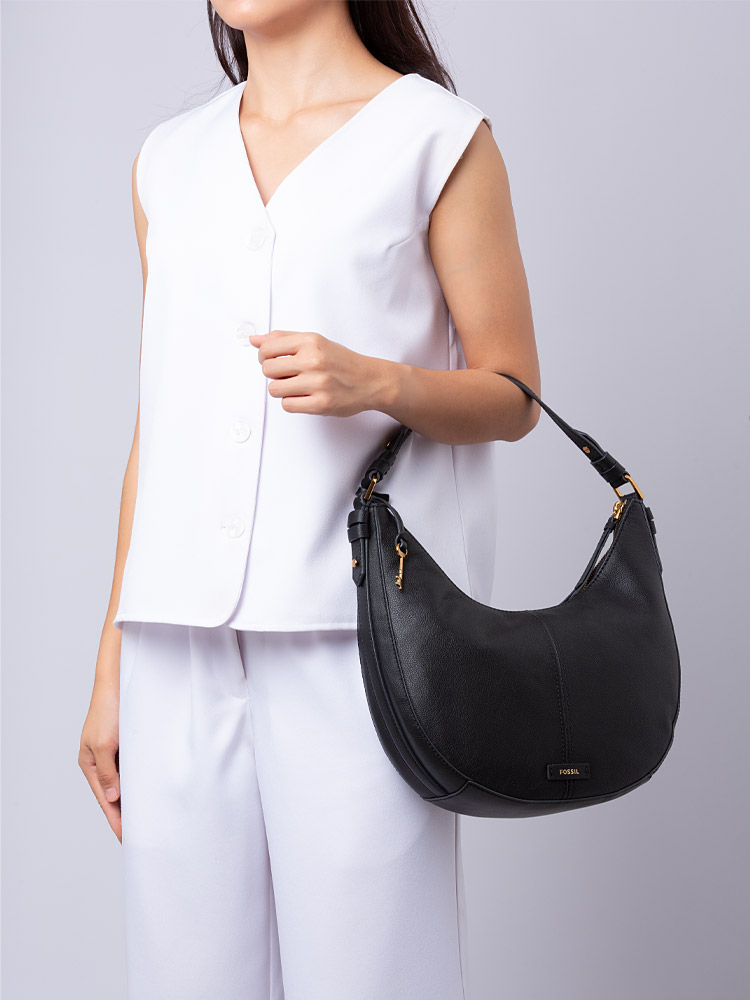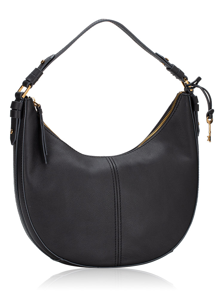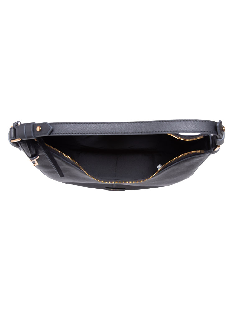 Made of pebble leather. The bag features a zip closure that opens to fabric lining with one slip pocket, one zip pocket, shoulder strap drop 21 cm.