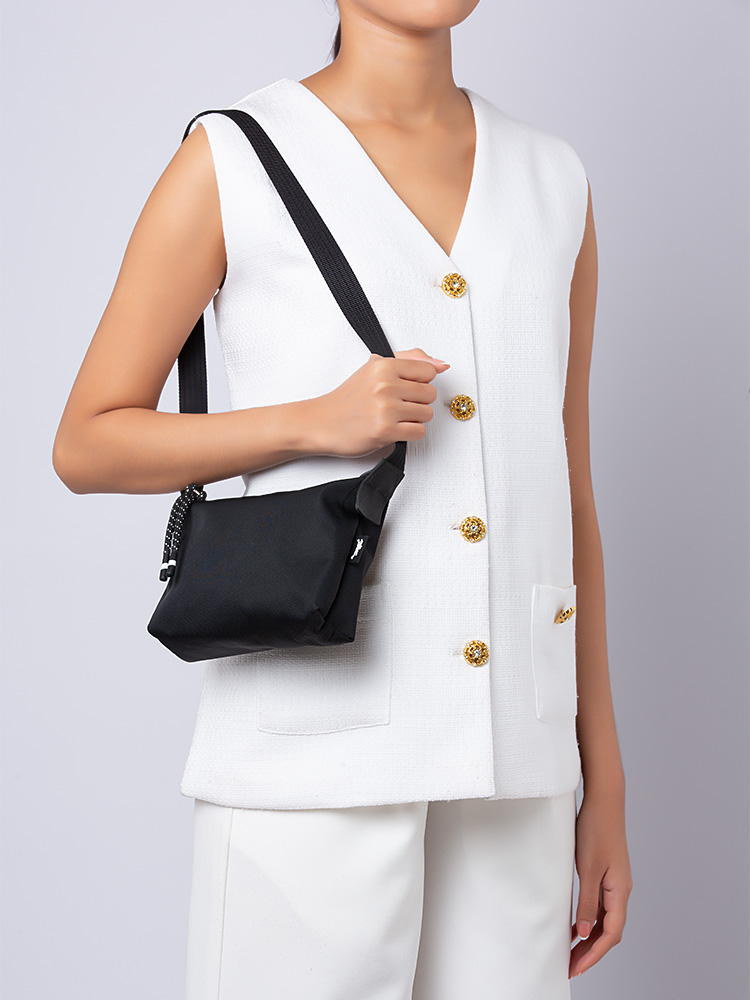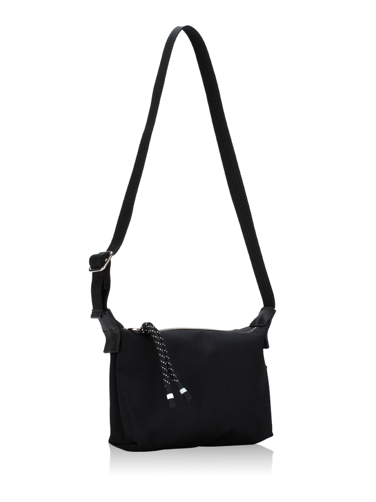 Made of Polyamide Canvas. The bag features a zip closure that opens to fabric lining with one slip pocket, adjustable strap.